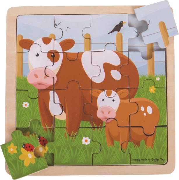 Văcuța grijulie împreună cu vițelul ei îi invită pe copii pe o pajiște verde – îi așteaptă o asamblare relaxantă, care sprijină motricitatea fină și răbdarea. Piesele sunt solide, finisate neted și adaptate mâinilor mici, astfel încât se manevrează ușor. Datorită formatului de 18 × 18 × 1 cm, puzzle-ul este potrivit atât acasă, cât și în călătorii.