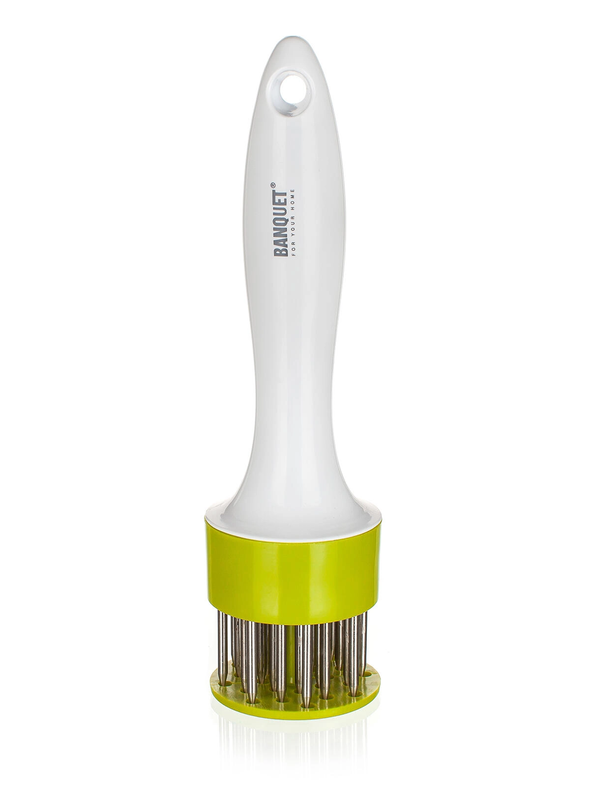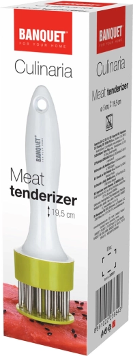 Mânerul ergonomic din plastic rezistent stă perfect în mână, iar orificiul pentru agățare permite depozitarea ușoară. Instrumentul este potrivit pentru toate tipurile de carne roșie – de la vită și porc până la vânat. Lungimea compactă, de aproximativ 19 cm, asigură o manevrare comodă și economie de spațiu în bucătărie.