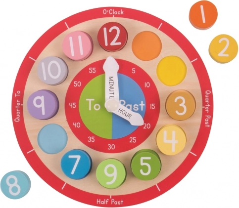 Această resursă educațională din lemn, de înaltă calitate, oferă copiilor de la 18 luni un mod distractiv de a învăța numerele, culorile, formele și bazele măsurării timpului. Piesele asortate cromatic cu numerele 1–12 se așază în sloturile corespunzătoare, sprijinind recunoașterea formelor și culorilor, precum și coordonarea mână–ochi. Etichetele clare în limba engleză de pe cadran ajută la însușirea naturală a expresiilor folosite pentru indicarea orei.