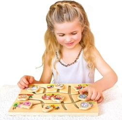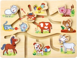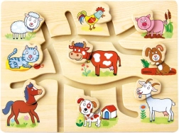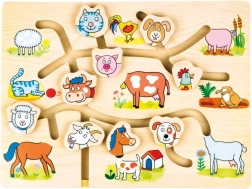 Descoperiți farmecul acestui puzzle din lemn cu tematică de fermă domestică, conceput pentru a stimula dezvoltarea copiilor. Labirintul este gândit să ajute la îmbunătățirea motricității fine și coordonării ochi-mână printr-un mod jucăuș și interactiv. Copiii nu doar învață să recunoască diferite animale, ci își exersează și orientarea spațială și gândirea logică.