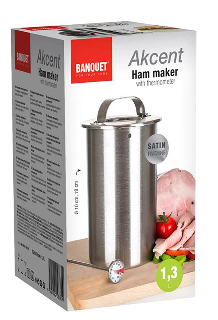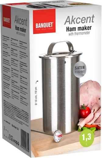 Pregătiți acasă o șuncă autentică, fără conservanți și adaosuri chimice. Acest șuncar din oțel inoxidabil de calitate 18/10, cu volum de 1,3 l și termometru integrat, permite prepararea facilă a cca 1 kg de carne. Datorită arcului și plăcii de presare, carnea este comprimată perfect, asigurând o formă compactă și o textură suculentă. Inox 18/10 rezistent, controlul temperaturii cu termometru, demontare și curățare ușoare, compatibil cu mașina de spălat vase.