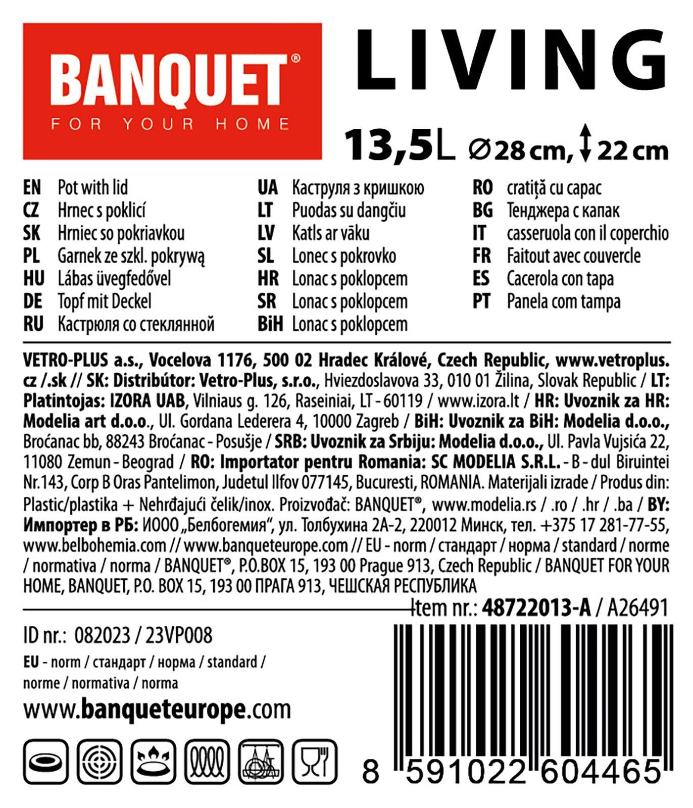 Oala încăpătoare din inox LIVING, cu volum de 13,5 l și capac din sticlă, este ideală pentru gătirea supelor, fondurilor și porțiilor mai mari. Oferă diametru de 28 cm, inox 201 de calitate, capac din sticlă cu mâner din inox și compatibilitate cu toate tipurile de plite, inclusiv inducție.