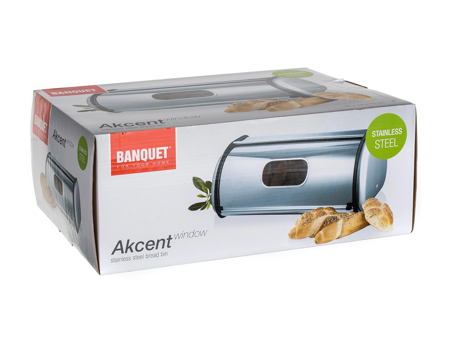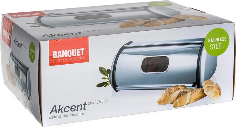 Cutia de pâine AKCENT din inox este un ajutor practic pentru depozitarea zilnică a pâinii, chiflelor și produselor de patiserie. Datorită prelucrării de calitate din oțel inoxidabil tip 201 și finisajului lucios, devine un accesoriu stilat pentru bucătăria dumneavoastră, ușor de întreținut.