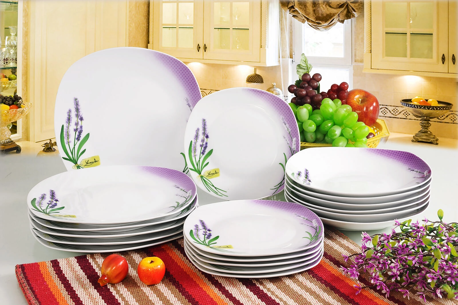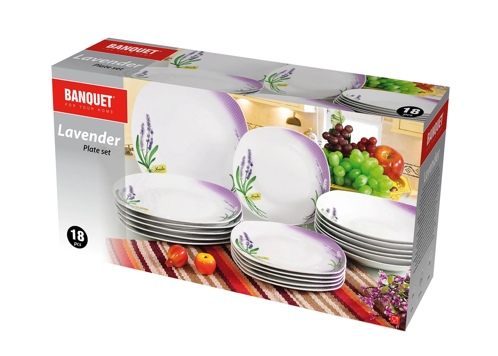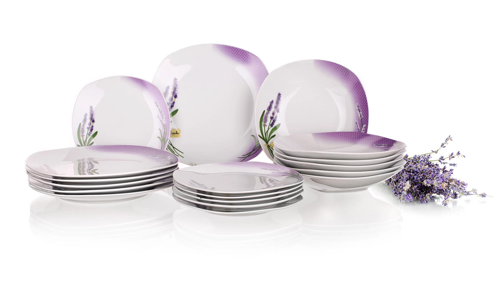Cele 18 piese includ farfurii adânci, întinse și pentru desert – toate asortate într-un design unitar Lavender Square pentru o masă impecabilă zi de zi.