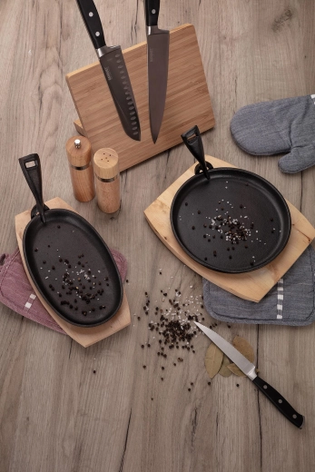 Pachetul include un tocător din lemn perfect adaptat, care servește drept suport pentru tigaia fierbinte și permite transportul în siguranță la masă.