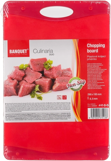 Tocătorul practic CULINARIA DUO, cu dimensiunile 37 × 25,5 cm, este realizat din plastic rezistent și oferă o suprafață antiderapantă pentru tăiere în siguranță. Datorită întreținerii ușoare și compatibilității cu cuțite din oțel și ceramice, este o alegere ideală pentru orice bucătărie. Designul bicolor în două nuanțe de roșu adaugă stil gătitului.
