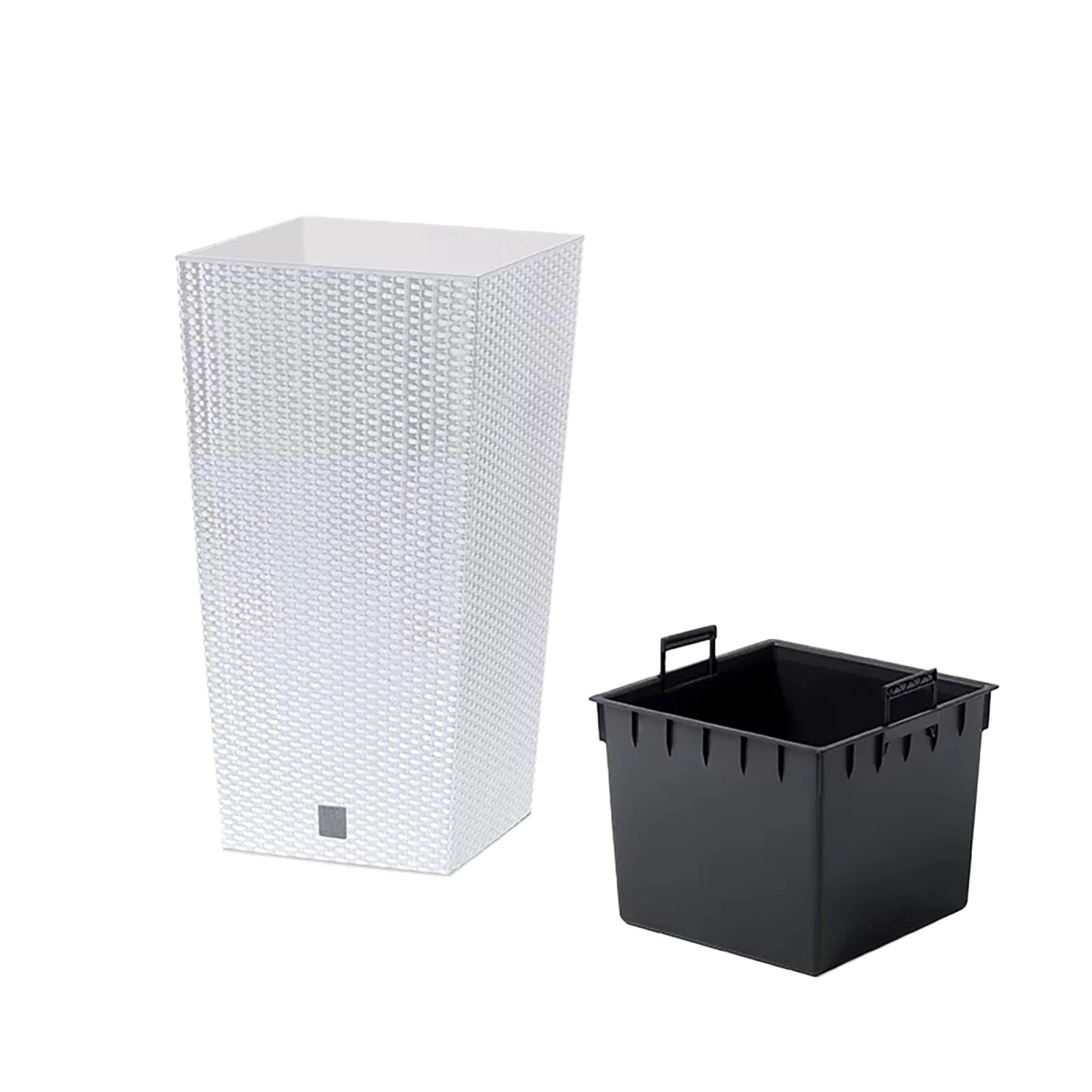 Ghiveci elegant din plastic cu aspect de ratan pentru interior, terasă și balcon. Oferă două volume pentru plantare, este ușor, rezistent și ușor de întreținut. Design modern, imitație fidelă de ratan și dimensiuni practice 26,5 × 26,5 × 50 cm care îl fac alegerea ideală pentru ierburi aromatice, flori și plante decorative.