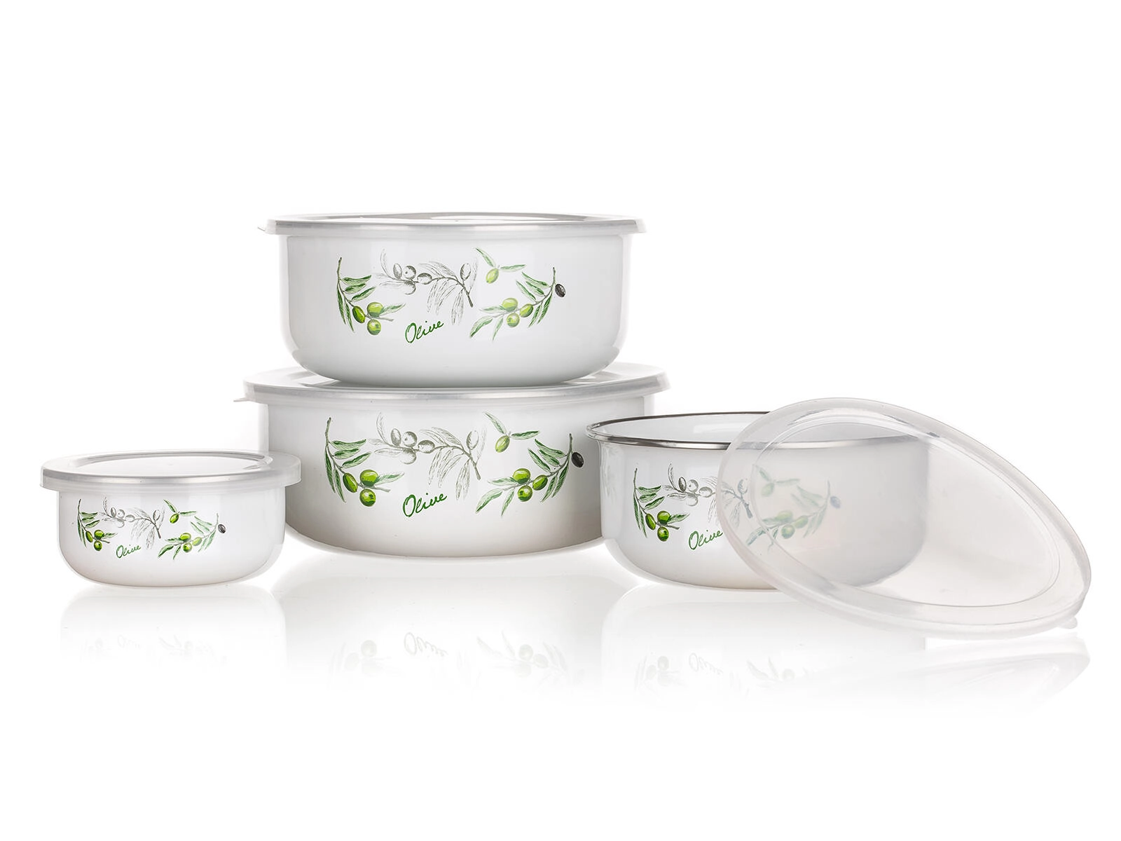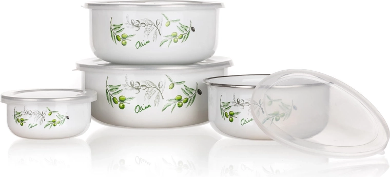 Set practic de patru boluri smălțuite cu capace din plastic și decor OLIVES pentru depozitarea alimentelor. Bolurile sunt ușoare, rezistente și, datorită capacelor, păstrează conținutul proaspăt mai mult timp. Datorită designului stivuibil economisesc spațiu, iar volumele diferite acoperă nevoile zilnice din bucătărie.