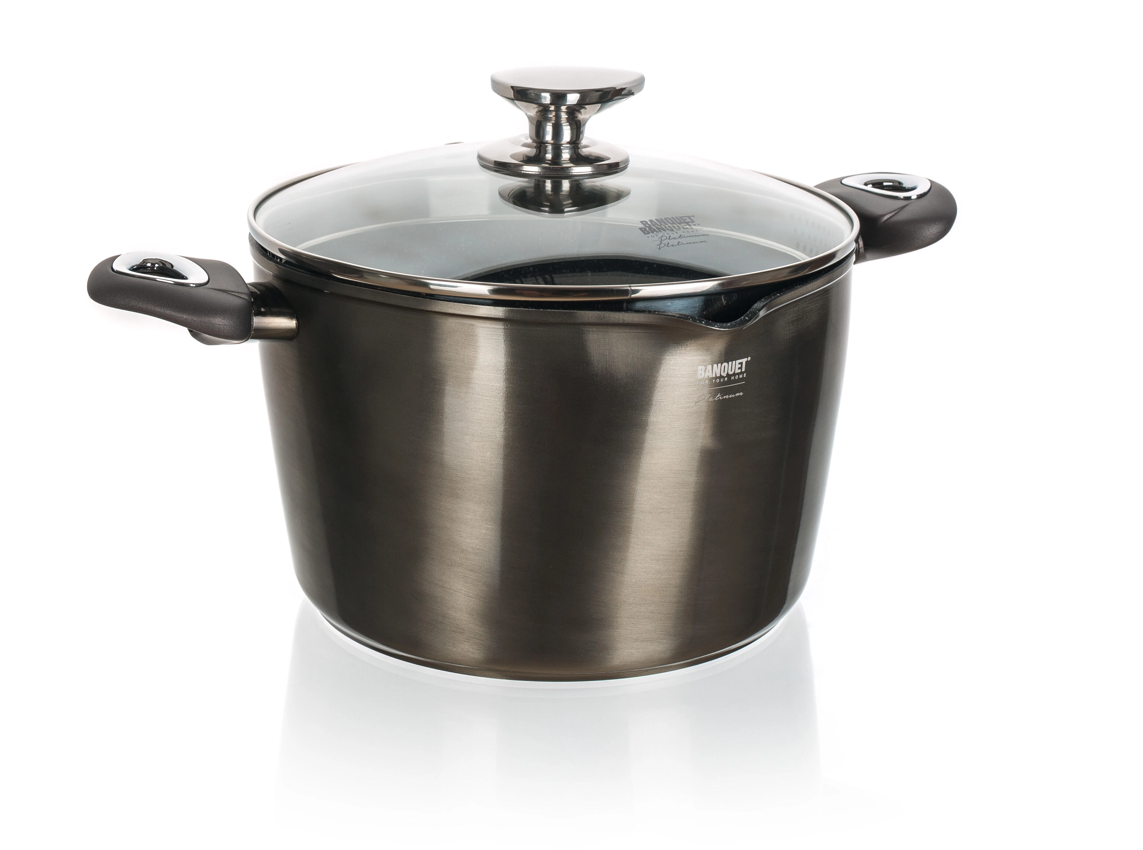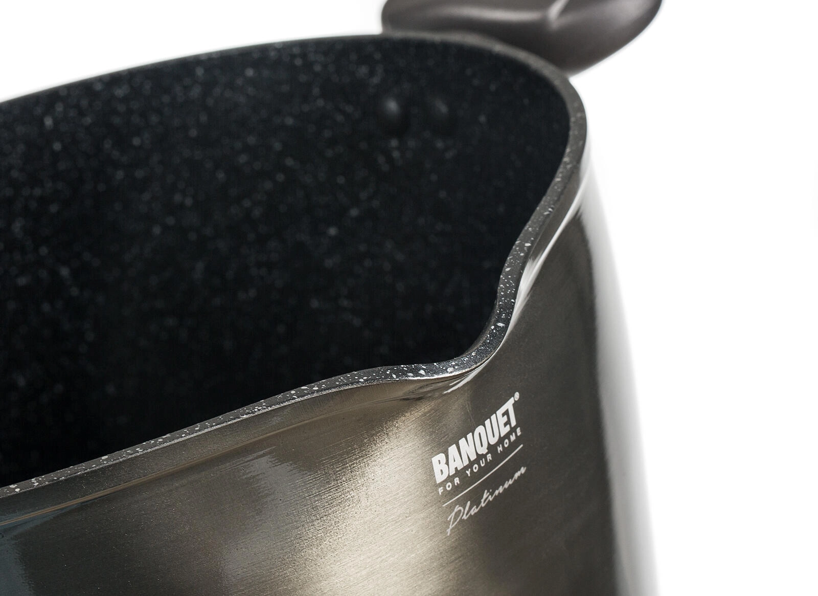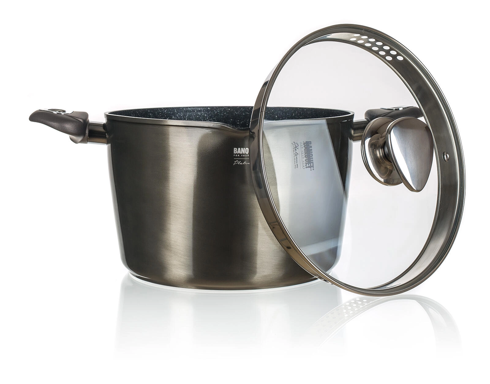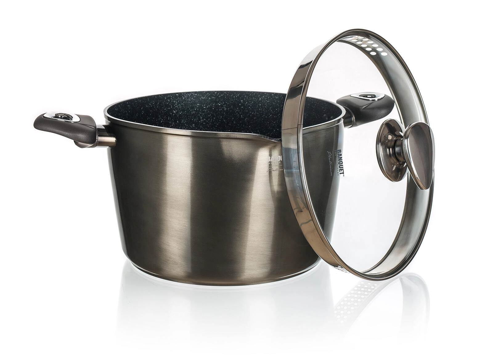 Gătiți supe, sosuri și paste fără lipire. Oala METALLIC PLATINUM se remarcă prin corpul din aluminiu turnat cu perete gros de 3 mm pentru distribuție uniformă a căldurii și gătire economică. Suprafața antiaderentă este extraordinar de dură și rezistentă la zgârieturi și impact, făcând față utilizării zilnice.