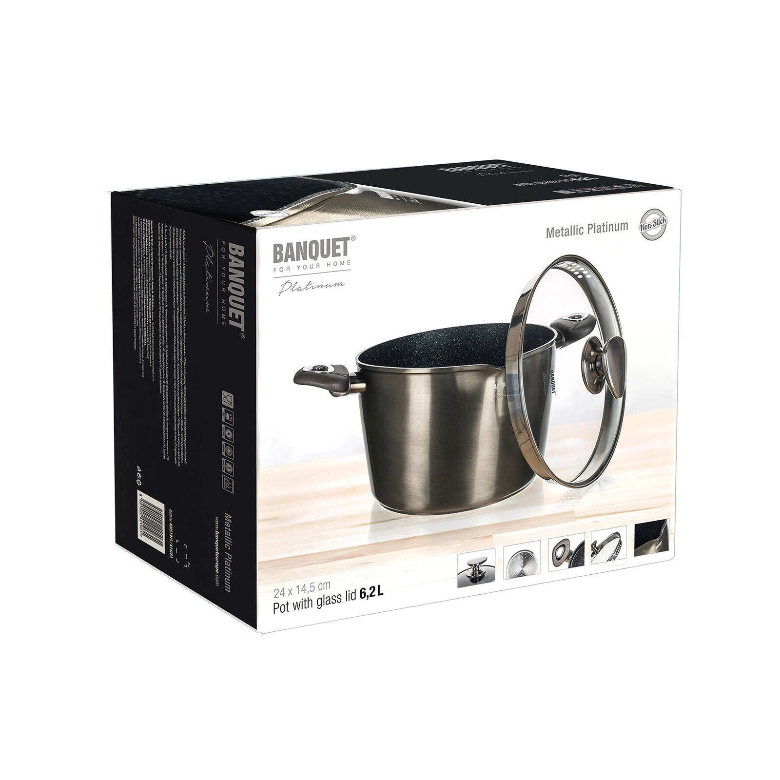 Oala robustă din aluminiu turnat METALLIC PLATINUM, cu volum de 6,2 l și diametru de 24 cm, oferă suprafață antiaderentă foarte rezistentă, bază complet inductivă pentru încălzire rapidă și cioc de turnare practic pentru scurgere ușoară. Capacul din sticlă cu ventil permite controlul gătirii, iar mânerele soft‑touch și butonul din oțel inoxidabil asigură o manipulare comodă și sigură.