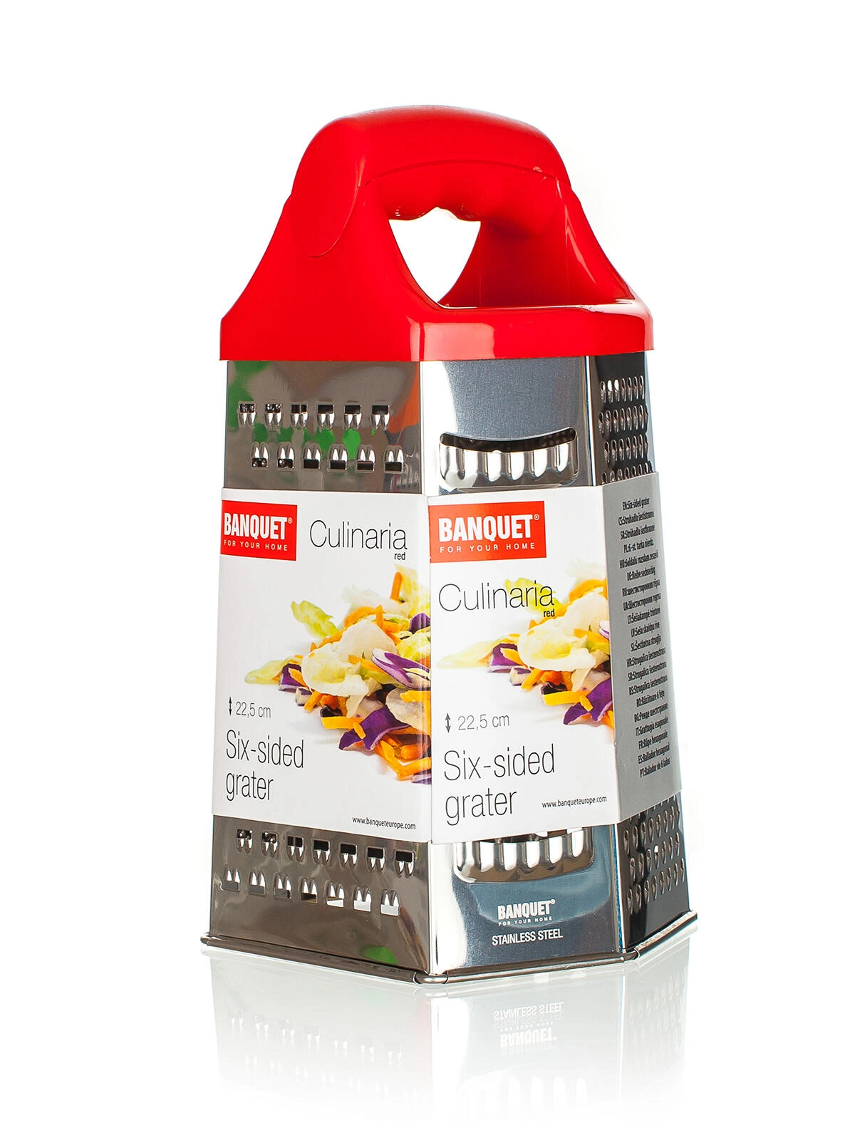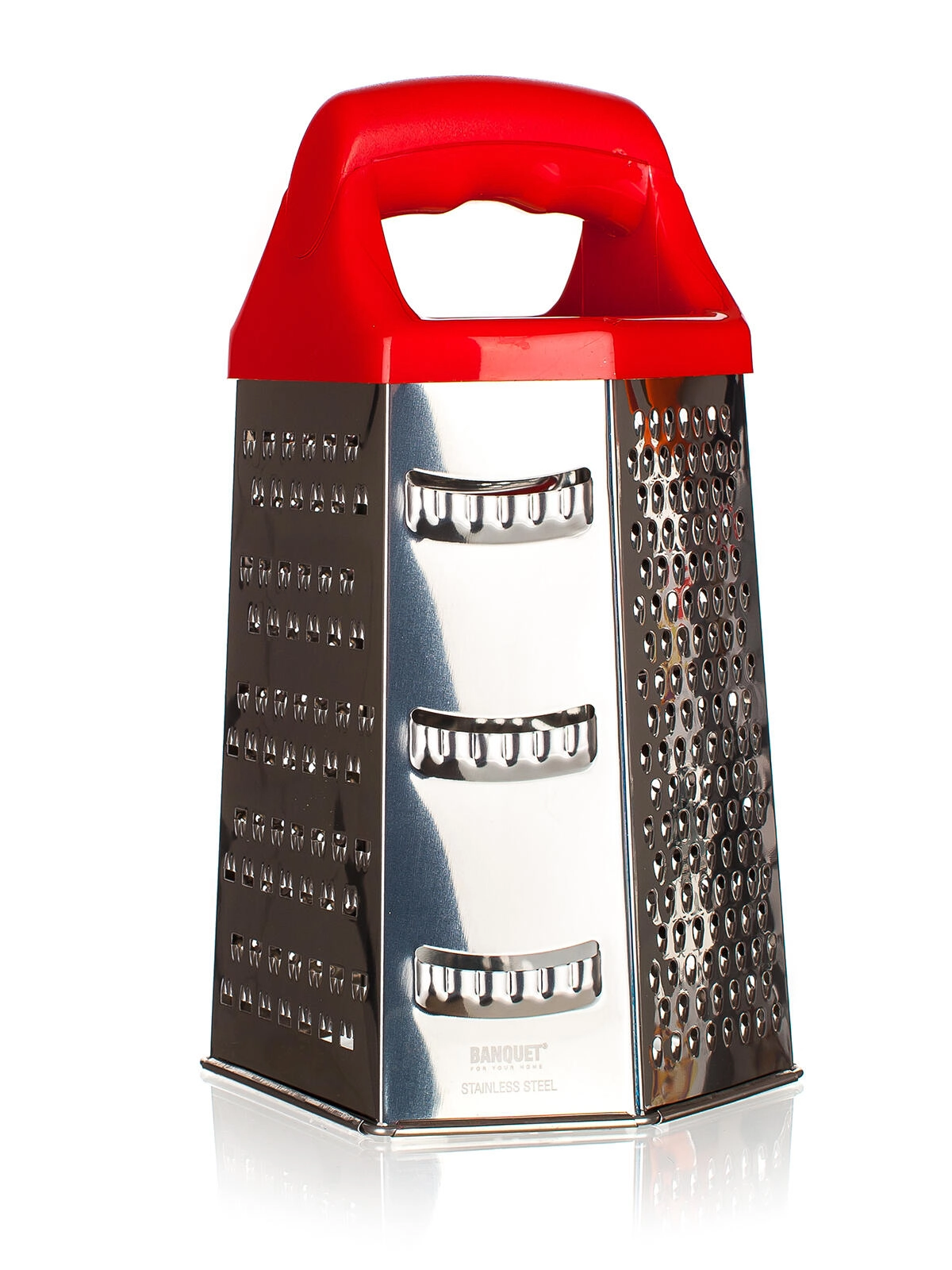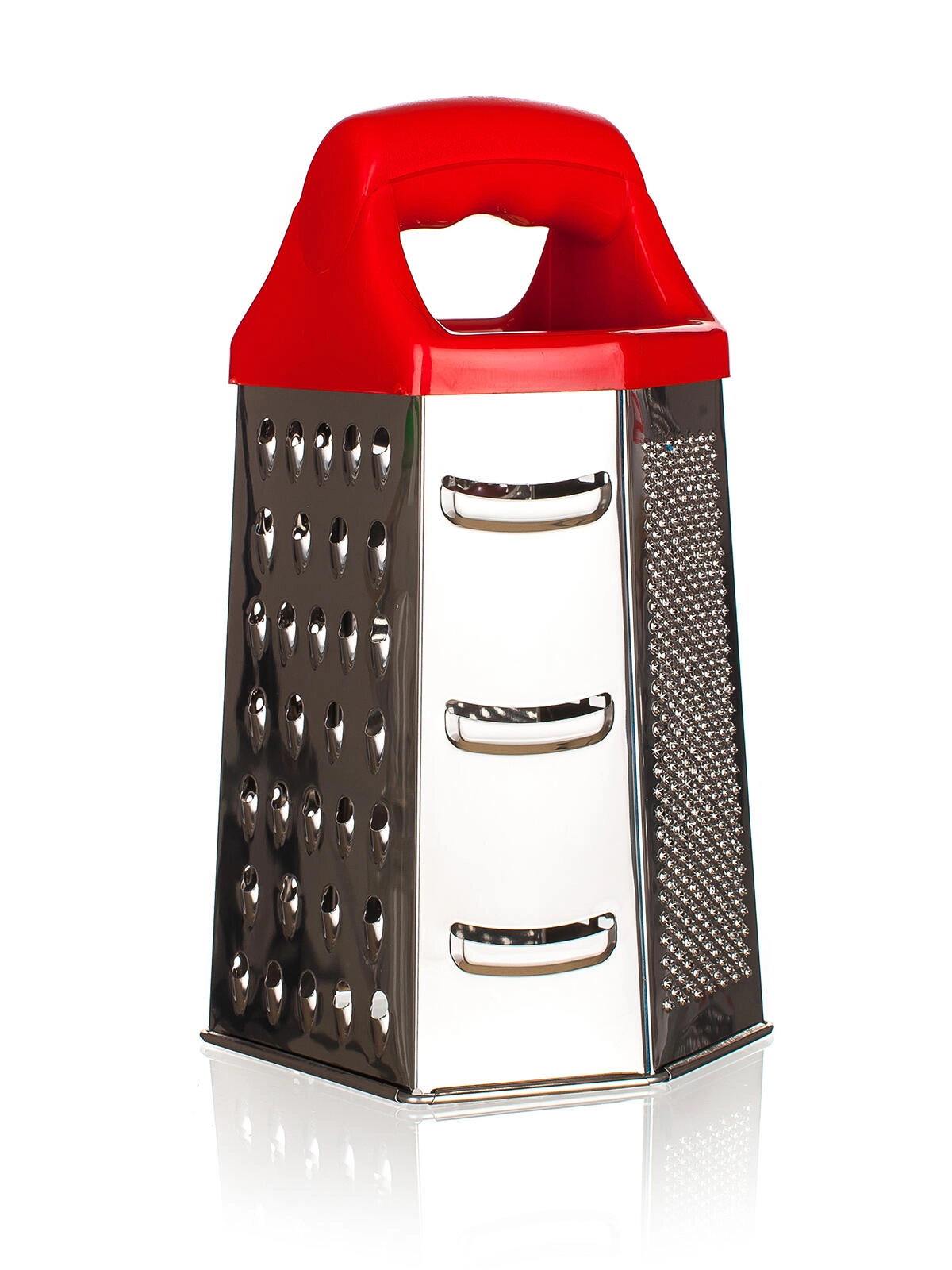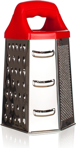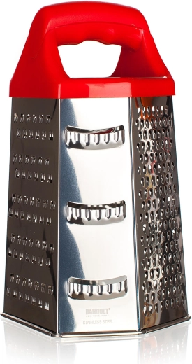 Fiecare față oferă o suprafață diferită: răzuire fină, medie și grosieră, precum și feliere. Ideală pentru brânză, legume, fructe sau ciocolată.