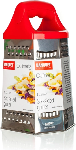 Descoperiți ajutorul universal pentru bucătărie: răzătoarea hexagonală din inox CULINARIA, cu înălțimea de 22,5 cm. Fiecare față oferă un alt tip de suprafață pentru prelucrarea perfectă a ingredientelor – de la răzuire fină ca pulbere, la fâșii medii și groase, până la feliere practică. Corpul robust din oțel inoxidabil 430 (18/0) și mânerul solid din plastic ABS asigură prindere sigură, stabilitate și durabilitate.