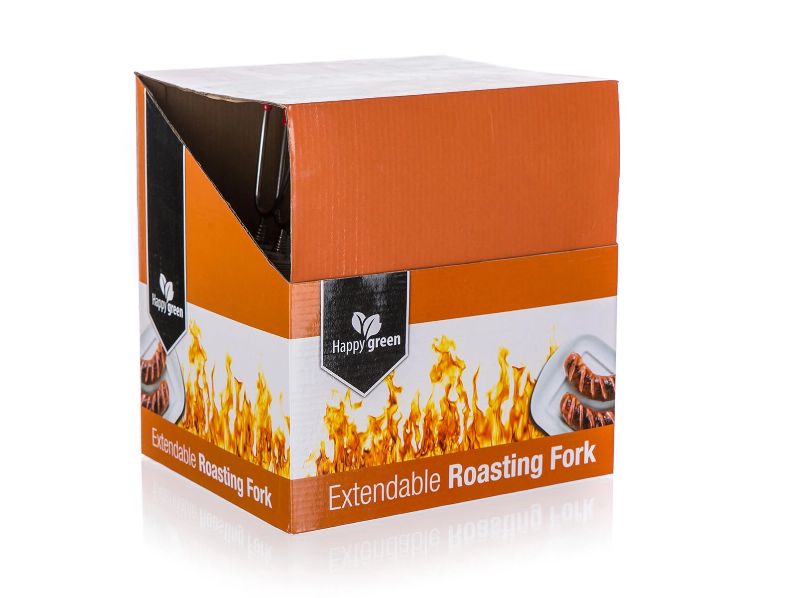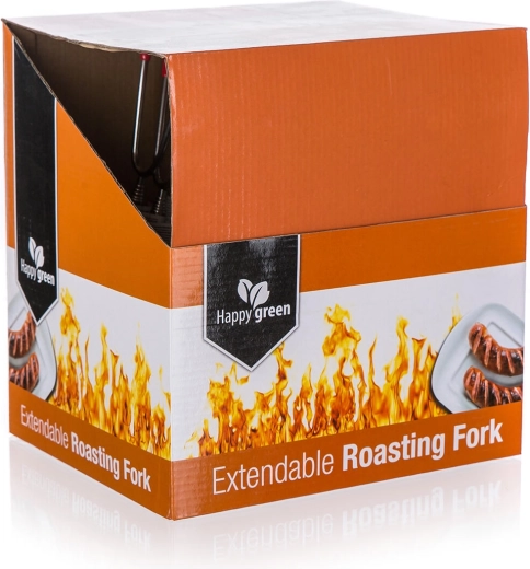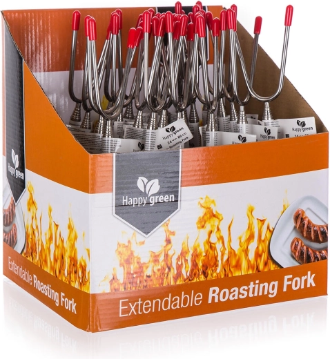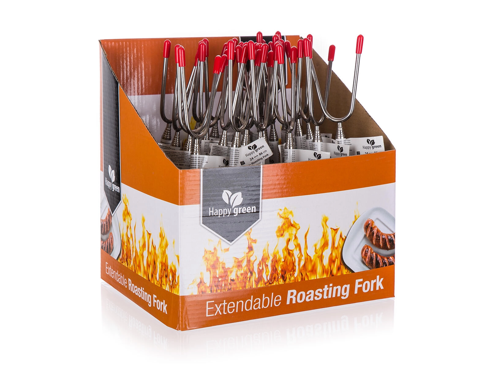 Furculă telescopică practică, cu lungime reglabilă 24–86 cm, din oțel inoxidabil și cu mâner din PVC confortabil. Ideală pentru fript crenvurști groși, cârnați și legume deasupra focului sau grătarului, cu două vârfuri solide pentru înfigere în siguranță.