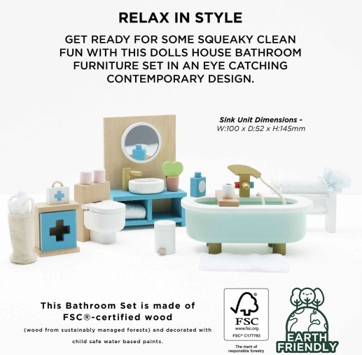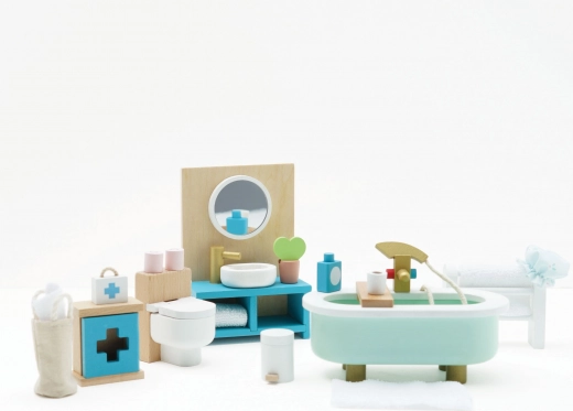 Set stilat de mobilier de baie pentru căsuța de păpuși la scară 1:12 de la LE TOY VAN. Include cadă, toaletă, chiuvetă, cuier pentru prosoape și dulăpior pentru medicamente, pictate manual cu vopsele netoxice pe bază de apă. Fabricat etic din materiale sustenabile, susține jocul creativ, abilitățile de comunicare și coordonărea.