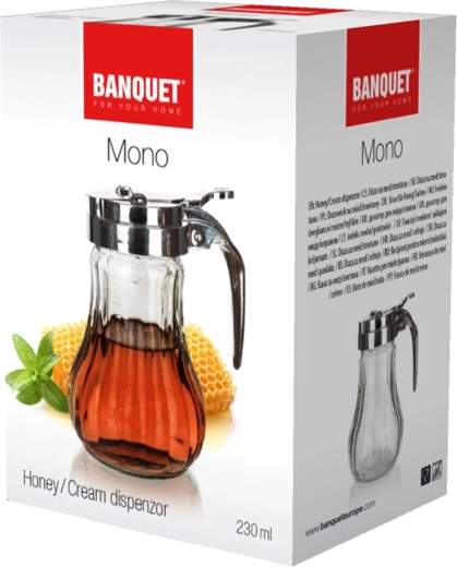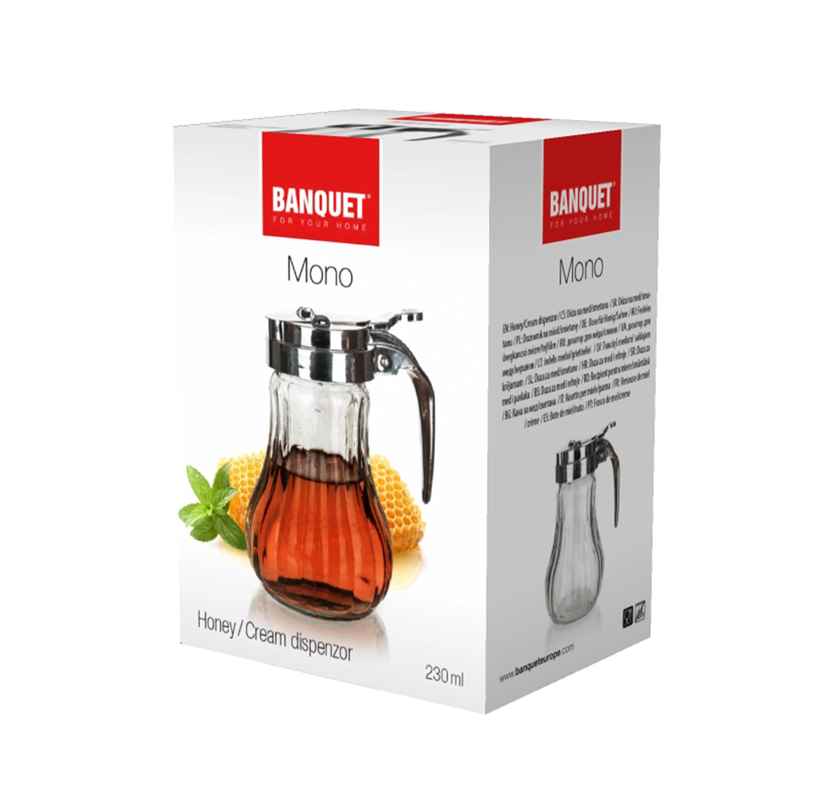 Borcașul practic din sticlă MONO, cu volum de 230 ml, este ideal pentru miere, frișcă sau sirop. Combinația de sticlă rezistentă, capac din inox și garnitură din silicon asigură turnare curată, fără picurare, durată lungă de viață și un aspect elegant pe orice masă.