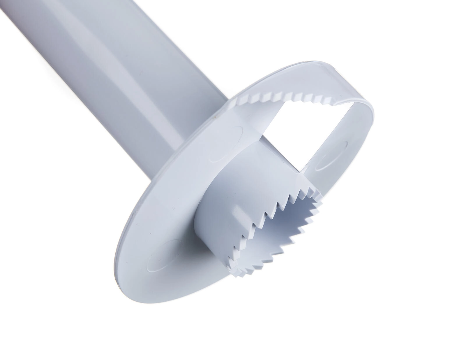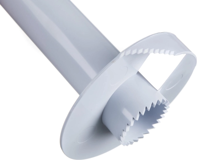 Marginea circulară zimțată taie pulpa și îndepărtează miezul tare, astfel obții inele frumoase, gata de servit.