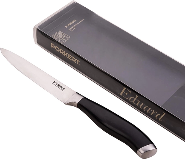 Cuțitul universal EDUARD, cu o lamă de 13 cm, este un ajutor de încredere pentru pregătirea zilnică a mâncărurilor. Fabricat din oțel german consacrat X50CrMoV15 (ISO 1.4116) pentru un echilibru perfect între ascuțiș, rezistență la coroziune și ușurința ascuțirii. Duritatea HRC 55 ±2 asigură performanță stabilă la tăierea cărnii, legumelor și a verdețurilor.