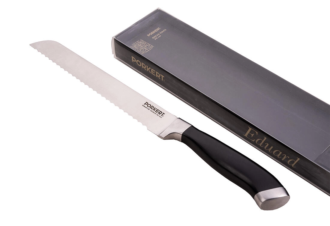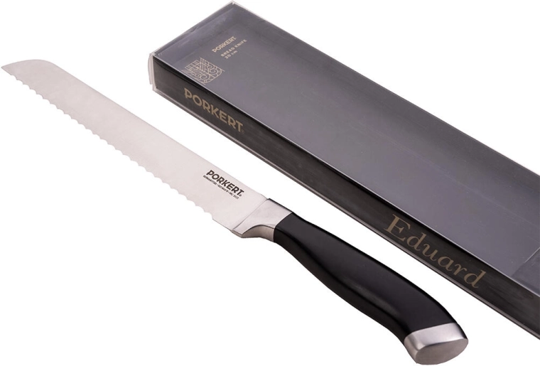 Cuțitul pentru pâine EDUARD este conceput pentru felierea precisă a produselor de panificație – de la baghete crocante la pâine proaspătă. Lama de calitate din oțel X50CrMoV15 (ISO 1.4116) cu duritate HRC 55 ±2 oferă ascuțime fiabilă și rezistență la uzură. Mânerul din plastic lustruit se potrivește bine în mână și sporește confortul și siguranța în timpul tăierii.