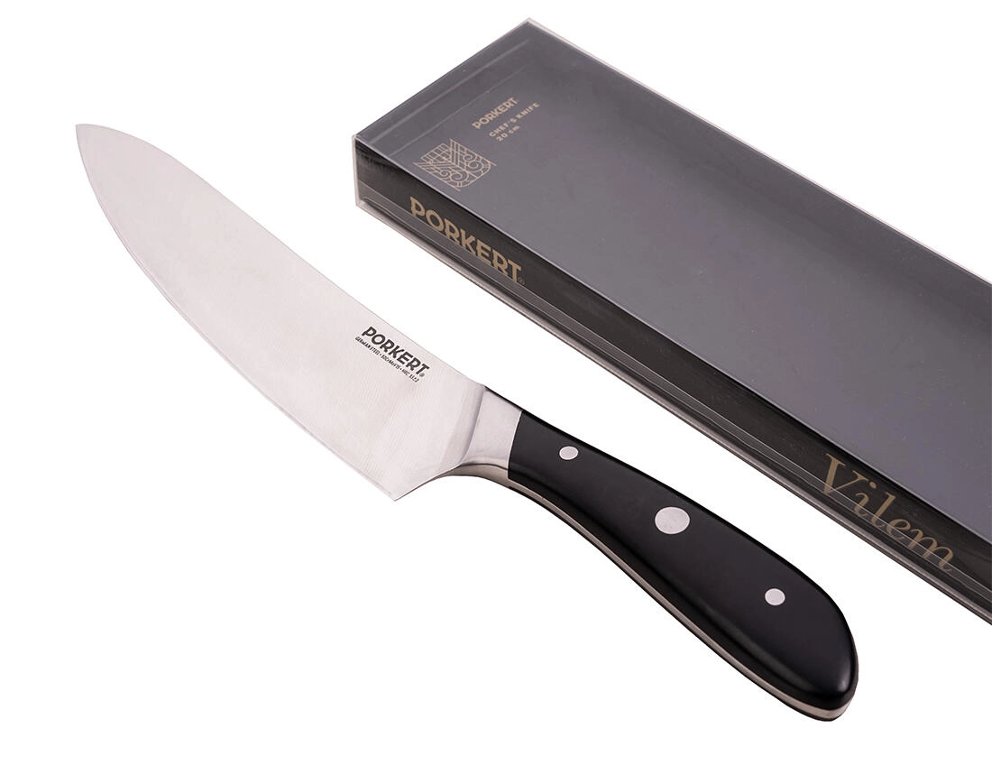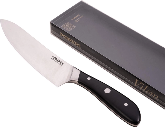 Cuțitul de bucătar Vilem, cu lamă de 20 cm, este o alegere universală pentru orice bucătărie. Oțelul de calitate X50CrMoV15 (ISO 1.4116) asigură un echilibru reușit între ascuțiș, rezistență la coroziune și ușurința ascuțirii. Mânerul ergonomic, din plastic lustruit, oferă o prindere sigură și confortabilă chiar și în timpul utilizării îndelungate.