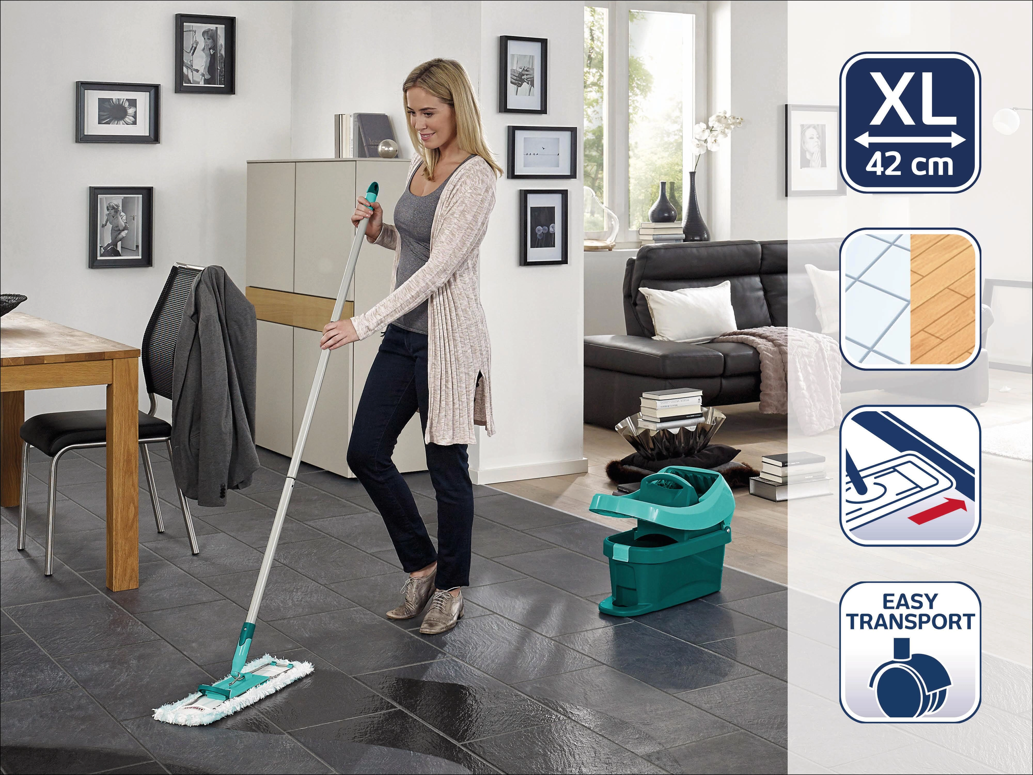 Setul LEIFHEIT PROFI aduce nivel profesional de curățenie în orice locuință. Lățimea generoasă de 42 cm și husa din microfibre foarte absorbantă fac față prafului, urmelor și petelor uscate. Datorită articulației, mopul se adaptează elegant spațiului și ajunge cu ușurință sub pat sau dulap.