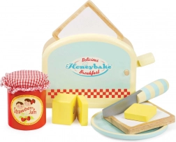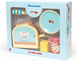 Setul din lemn Honeybake de la LE TOY VAN transformă colțișorul copiilor într-o bucătărie primitoare. Cei mici vor adora prăjitorul realist cu arc, din care, la apăsare, sar două felii de „toast”. Untul cu prindere tip scai îi învață prinderea corectă și mânuirea cuțitului, iar borcănelul de dulceață de căpșuni și farfurioara completează fiecare mic dejun jucăuș.