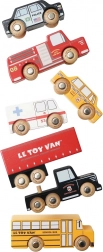 Autobuz școlar, mașină de pompieri, ambulanță, mașină de poliție, taxi și camion articulat alcătuiesc un set variat care inspiră povești din străzile aglomerate ale orașului.