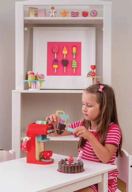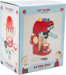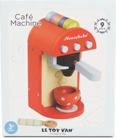 Acest espressor din lemn de calitate oferă copiilor o experiență autentică de preparare a cafelei. Capsule colorate pot fi introduse în pârghie pentru a „prepara” băutura direct în ceașca pictată, iar setul include spumator de lapte și linguriță. Capsule pot fi depozitate comod în orificiul din partea superioară a espressorului, astfel încât totul este la îndemână.