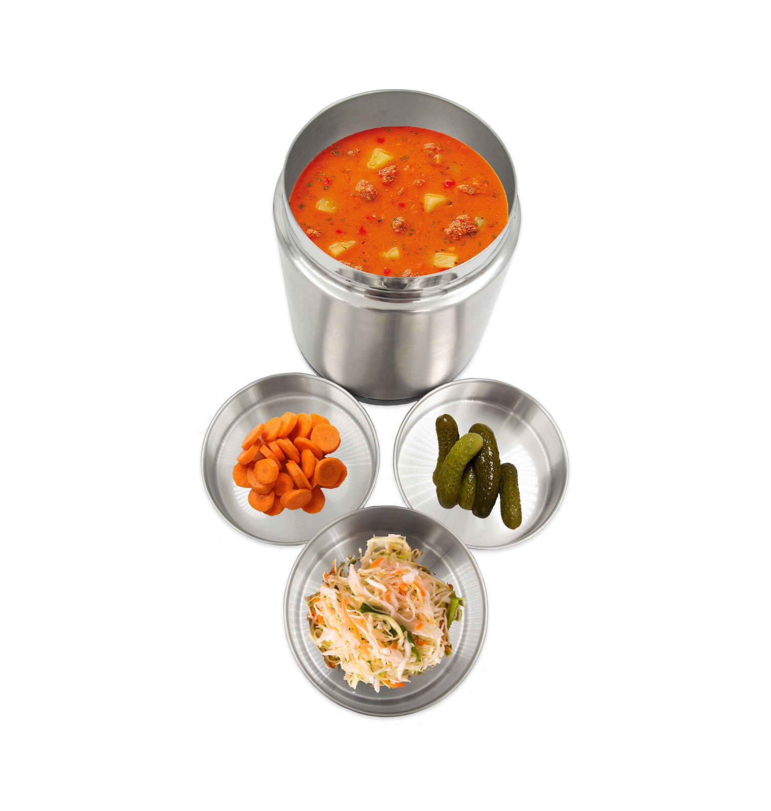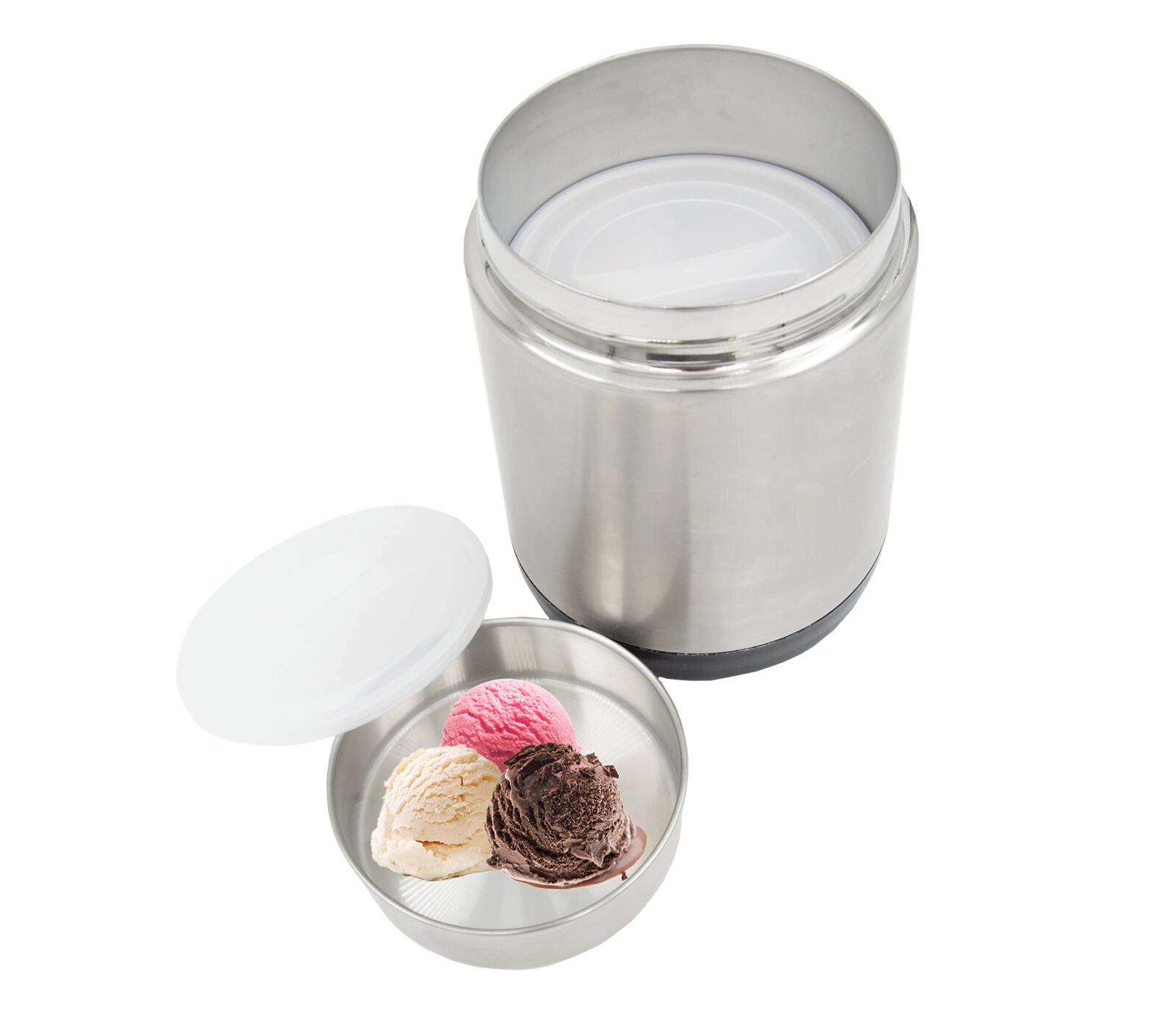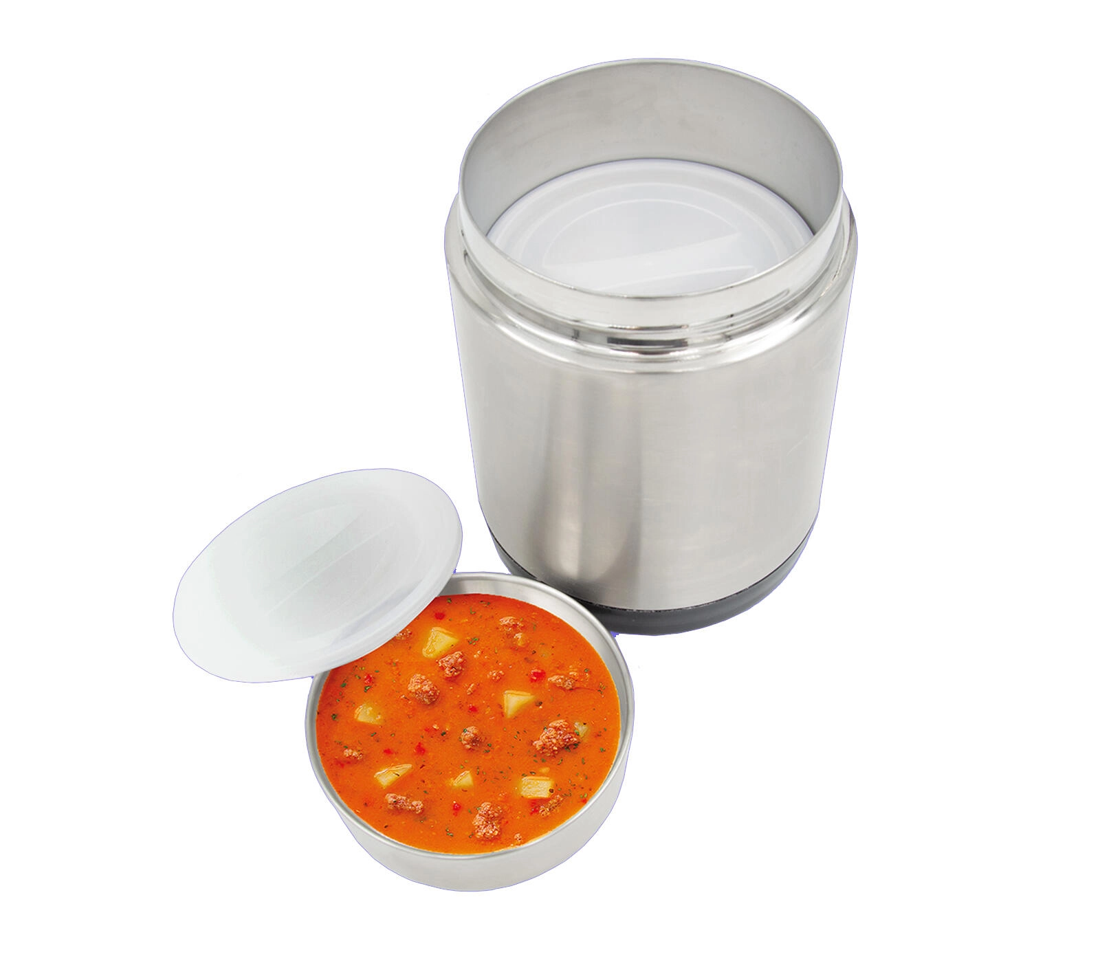 După îndepărtarea bolurilor, recipientul poate fi folosit ca un termos încăpător pentru supe, risotto sau sosuri. Gâtul larg facilitează umplerea și curățarea, iar inoxul de calitate asigură durabilitate îndelungată. Este excelentă pentru utilizare zilnică la serviciu, în călătorii, sport sau pentru persoanele care nu iau masa la restaurant. Recipientul termic este potrivit și pentru deserturi reci, de exemplu înghețată.