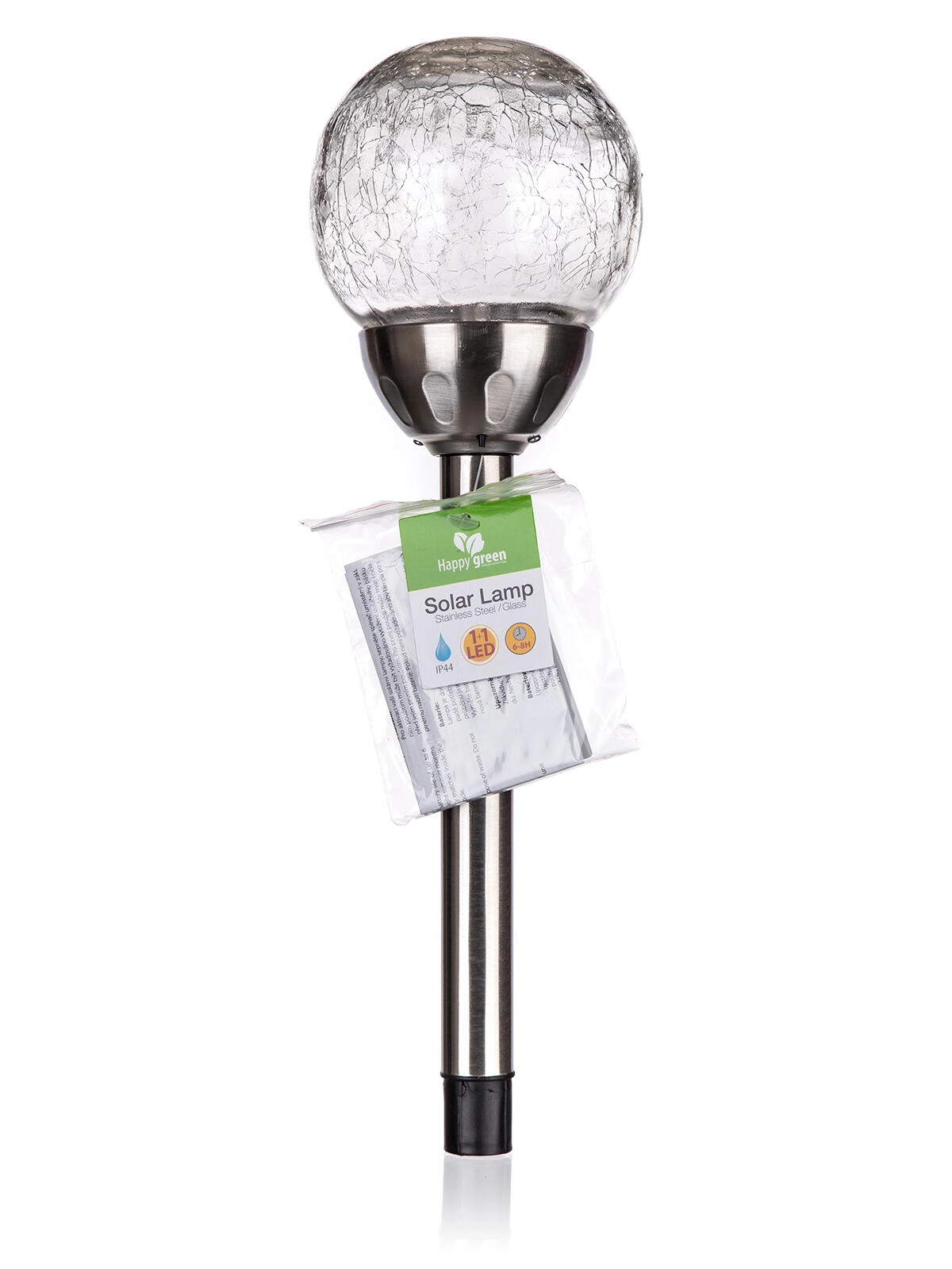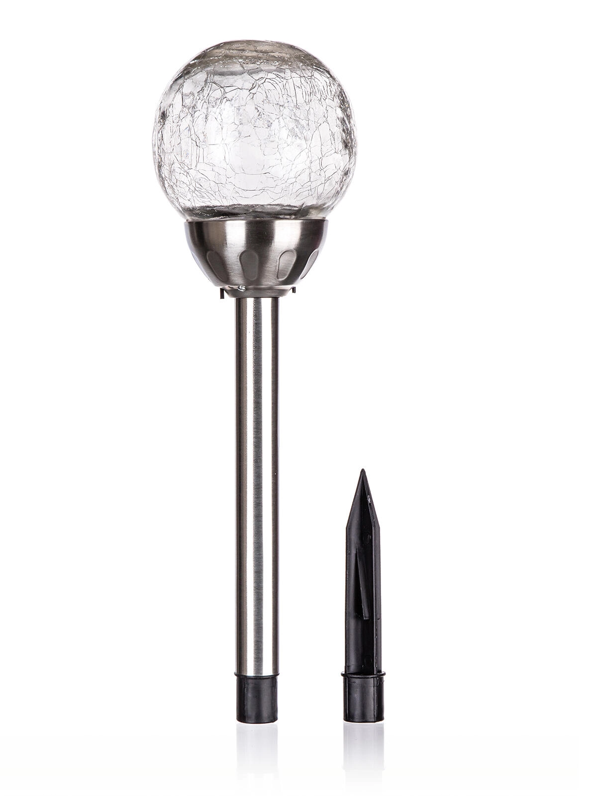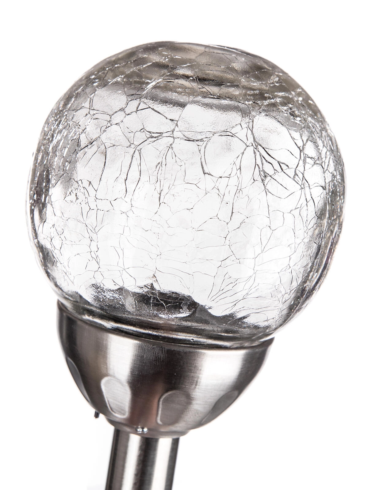 Lampă solară decorativă cu glob de sticlă cu efect crăpat, diametru 10 cm și înălțime 38,5 cm, care aduce lumină stilată grădinii și aleilor tale. Datorită combinației de LED alb și LED color, poți comuta ușor modul de iluminare între alb stabil și spectru de culori în mișcare. Construcție din inox rezistentă, instalare ușoară în sol și protecție IP44 pentru utilizare fiabilă în exterior.