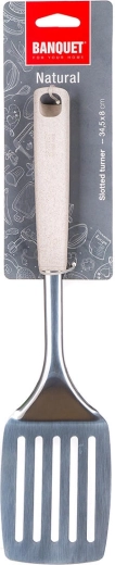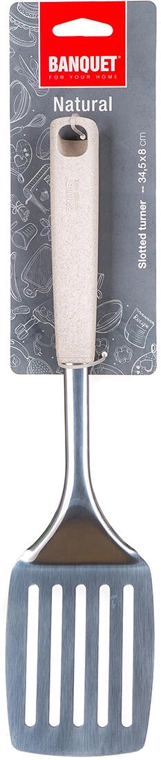 Mânerul din polipropilenă și tărâțe de grâu se așază plăcut în mână și permite manevrare confortabilă. Datorită orificiului practic, ustensila poate fi ușor agățată și păstrată mereu la îndemână. Dimensiunile generoase de 34,5 × 8 cm facilitează întoarcerea porțiilor mai mari, a clătitelor sau a fileurilor.