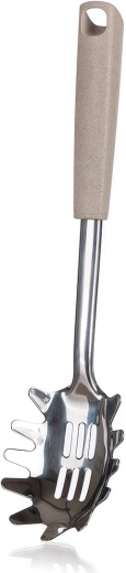 Această lingură pentru spaghete, cu dimensiunile 32,5 × 6,8 cm, facilitează servirea pastelor fără dezordine. Oțelul inoxidabil de calitate rezistă la coroziune și la utilizarea zilnică, în timp ce mânerul ergonomic din polipropilenă și tărâțe de grâu se potrivește plăcut în mână.
