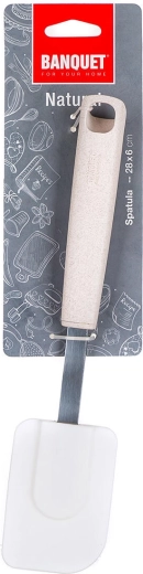 Spatula de bucătărie NATURAL, cu dimensiuni de 30 × 8 cm, combină un mâner durabil din inox și o parte funcțională flexibilă din silicon pentru întinderea și amestecarea precisă a cremelor. Potrivită pentru utilizare profesională și casnică, cu agățătoare pentru suspendare și posibilitate de spălare în mașina de vase. Oferă design atemporal și durată de viață lungă.