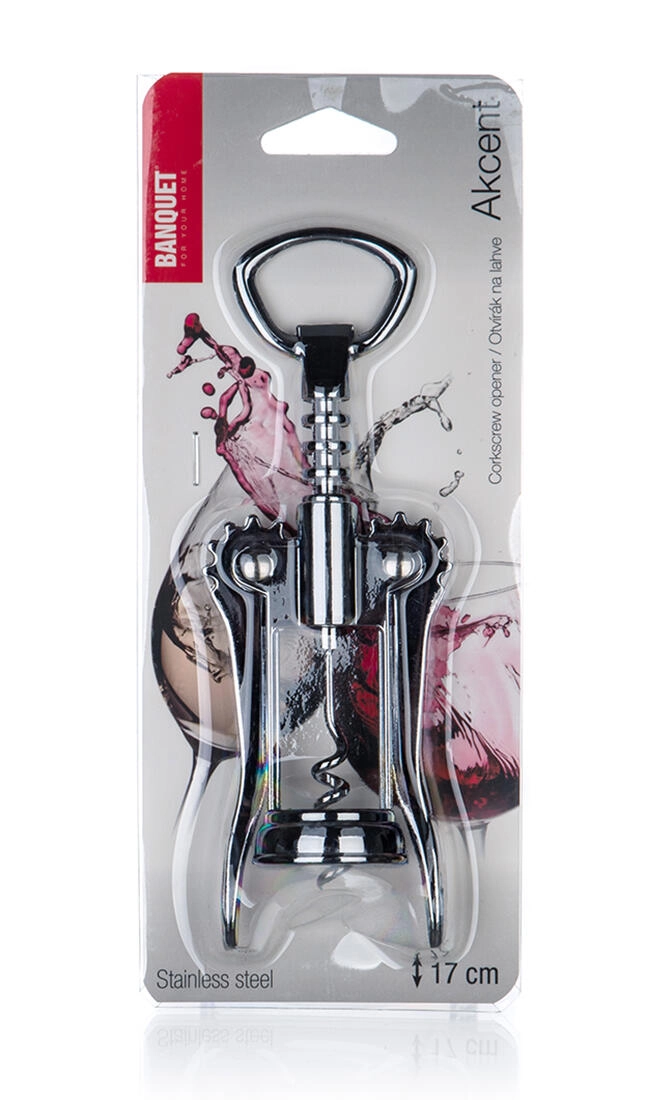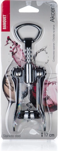 Deschizător practic de vin cu aripi AKCENT, lungime 17 cm, pentru deschiderea ușoară și rapidă a sticlelor. Datorită brațelor cu pârghie, scoți dopul fără efort și cu siguranță. Corpul din aliaj de zinc rezistent, cu suprafață cromată, și mânerul din plastic pentru gâtul sticlei asigură o utilizare confortabilă și sigură. Accesoriu ideal pentru acasă și petreceri – elegant, durabil și ușor de manevrat.