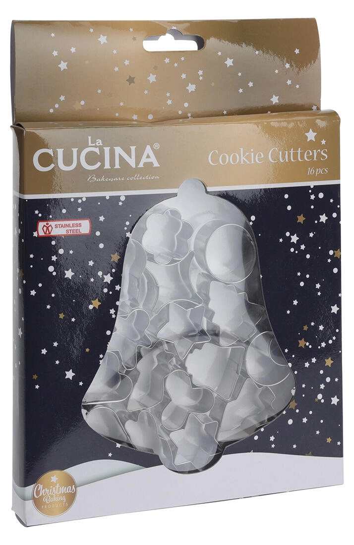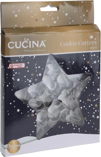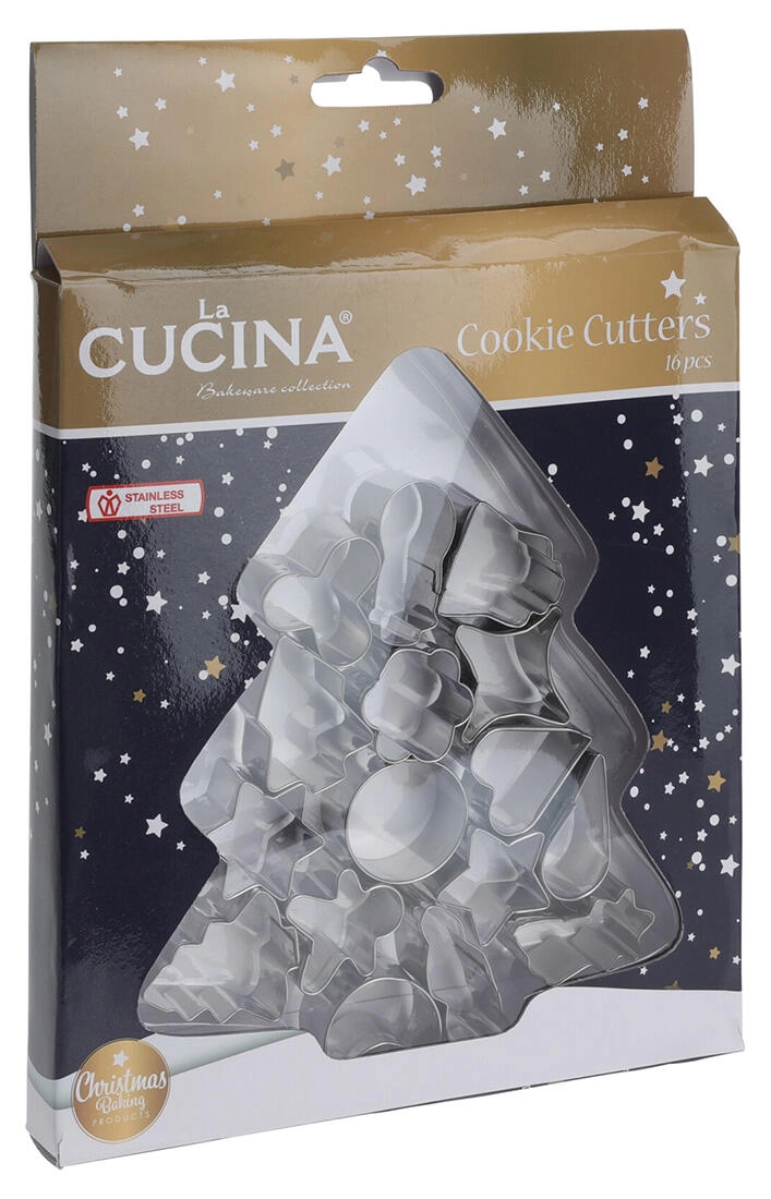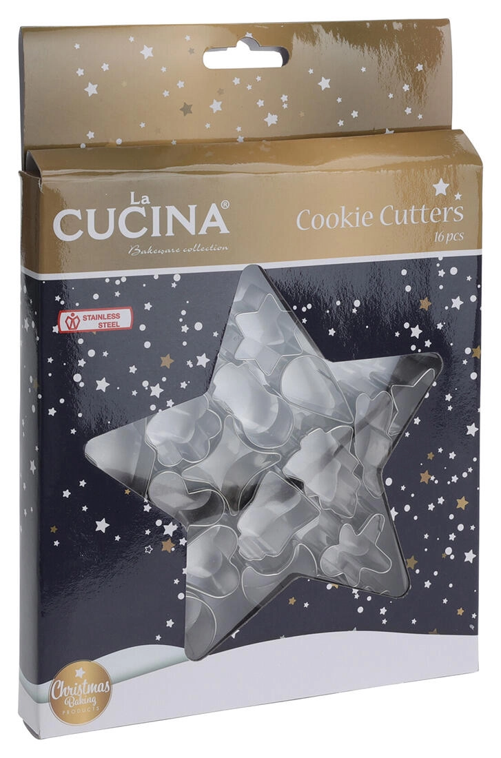 Acest set universal de 16 forme din inox este ideal pentru pregătirea prăjiturilor de Crăciun tradiționale sau moderne. Datorită construcției robuste din oțel inoxidabil de calitate, decupezi cu ușurință forme curate și precise, care nu se deformează la copt.