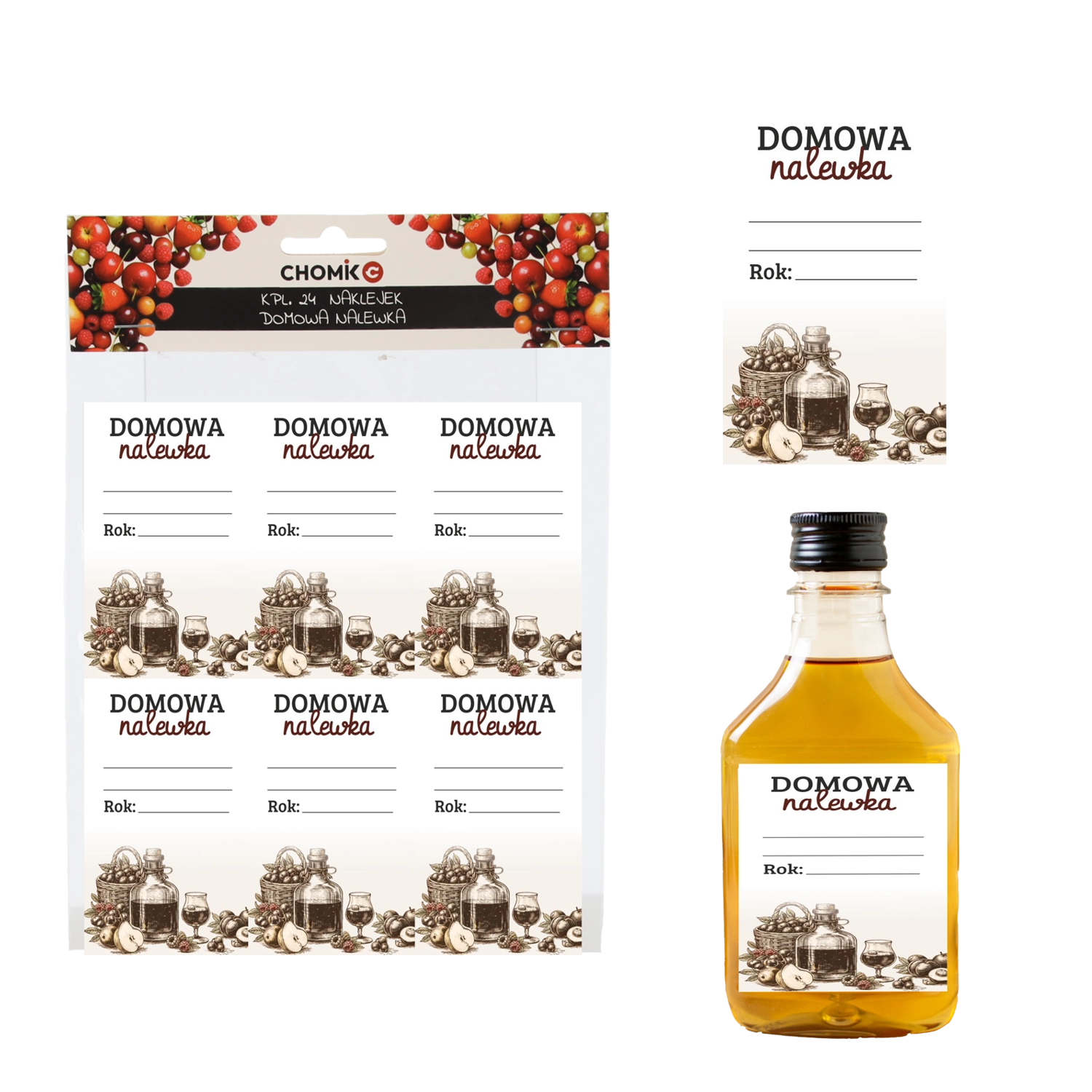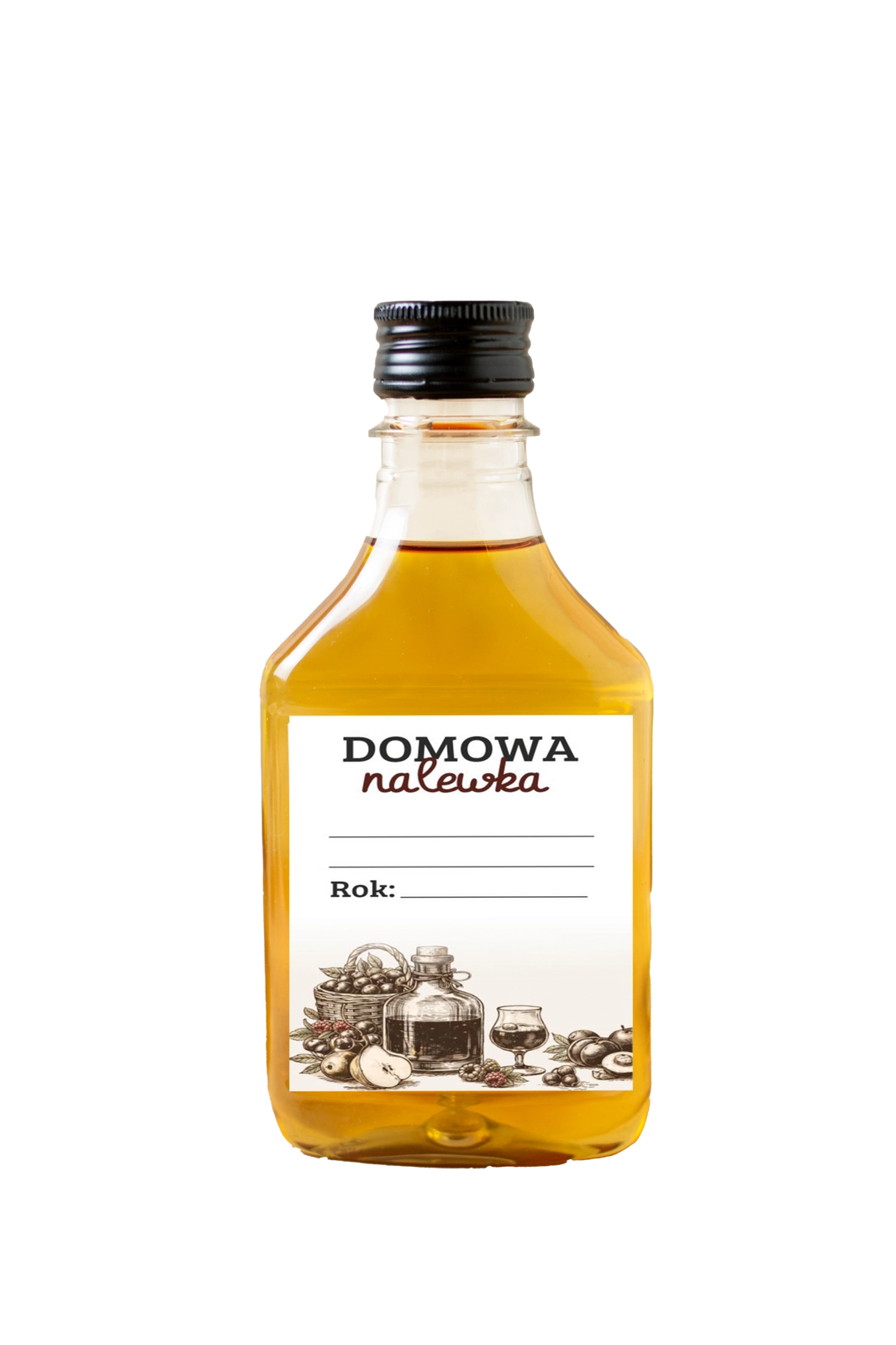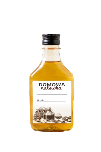 Designul universal „Domowa Nalewka” se potrivește unei game largi de băuturi de casă – de la lichioruri de fructe la macerate din plante. Eticheta oferă spațiu generos pentru denumirea lichiorului, data producerii sau alte informații, astfel încât sticlele tale să fie etichetate clar și elegant.