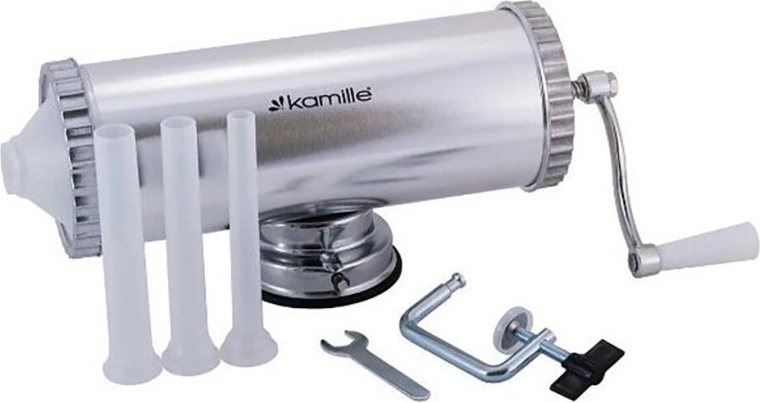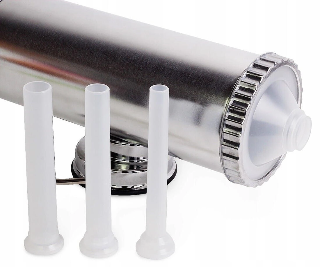 Stabilitatea în timpul lucrului este asigurată de ventuza puternică și de posibilitatea de fixare cu șurub. Pachetul include 3 duze cu diametre diferite pentru umplerea jitrnicelor, cârnaților subțiri și a kabanosului. Tuburile interschimbabile facilitează schimbarea rapidă a dimensiunii în funcție de rețetă și tipul de membrană.