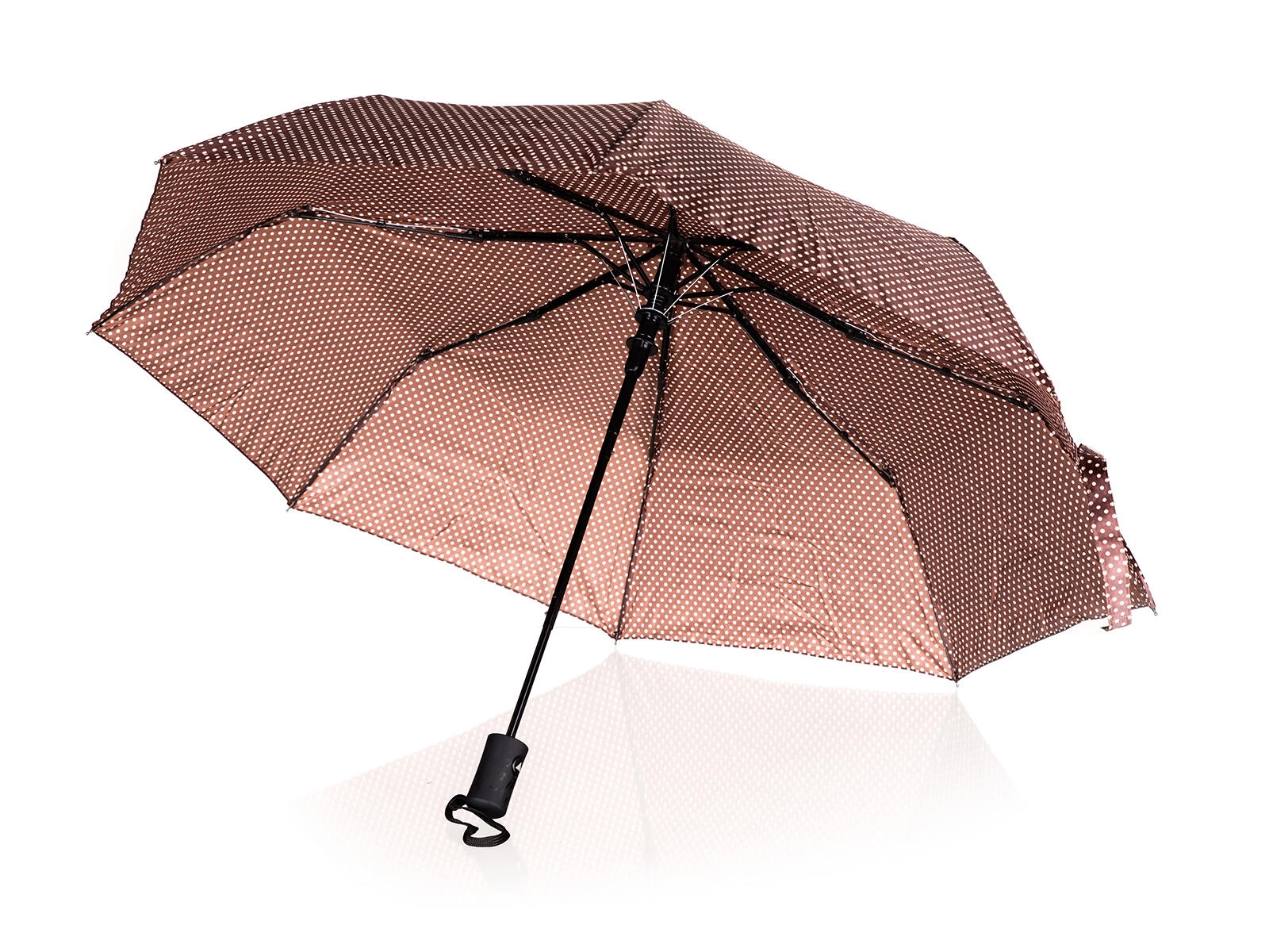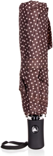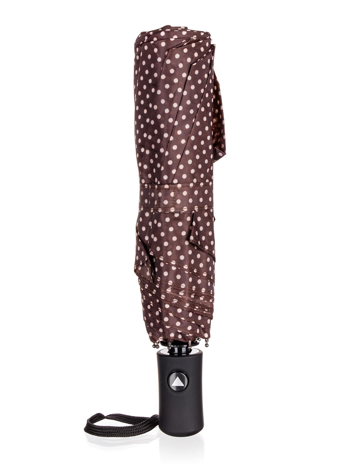 Umbrelă pliabilă elegantă, cu diametrul de 52 cm, în culoare maro sofisticată cu buline albe, oferă protecție fiabilă împotriva ploii și soarelui. Datorită dimensiunilor compacte este ideală pentru geantă sau rucsac, deschiderea automată asigură o utilizare comodă, iar construcția rezistentă la vânt îi prelungește durata de viață. Poliesterul impermeabil se întreține ușor și se usucă rapid.