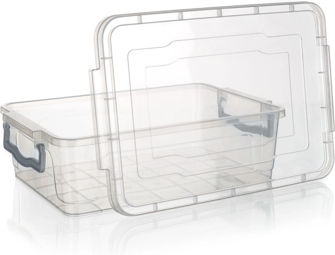 Cutia de depozitare Gema, cu un volum de 7 litri, este un ajutor multifuncțional pentru organizarea de zi cu zi. Datorită corpului transparent, găsești rapid ceea ce ai nevoie, iar clemele gri mențin capacul bine fixat. Plasticul rezistent facilitează întreținerea și asigură o durată lungă de viață chiar și în cazul utilizării frecvente.