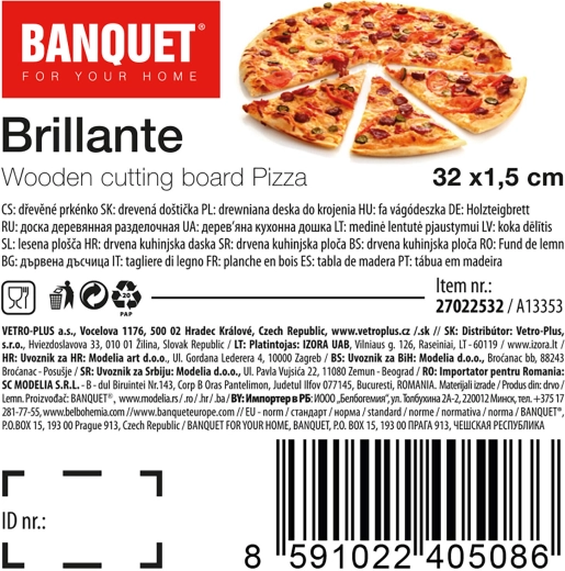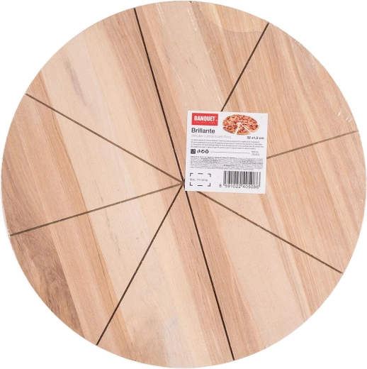 Placa din lemn pentru pizza BRILLANTE, cu diametrul de 32 cm, este ideală pentru servire și tăiere. Fabricată din lemn de calitate, oferă un aspect natural, rezistență și blândețe față de cuțite. Datorită înălțimii de 1,5 cm, este stabilă și ușor de manevrat.