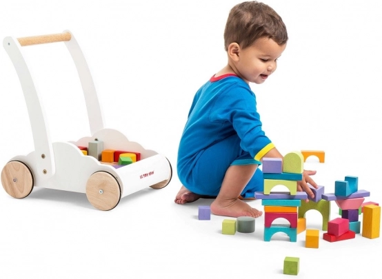 Căruciorul include 45 de cuburi colorate, care susțin creativitatea și dezvoltarea abilităților motorii.