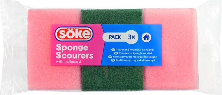Set practic de bureți de vase modelați, în pachet de 3 bucăți, asigură spălarea eficientă a farfuriilor, oalelor și tigăilor. Combinația dintre partea moale și partea verde abrazivă face față chiar și murdăriei persistente, în timp ce forma ergonomică oferă priză confortabilă și manevrare ușoară. Mixul de culori facilitează diferențierea bureților pentru diverse suprafețe.