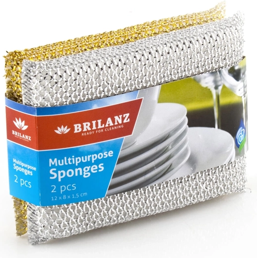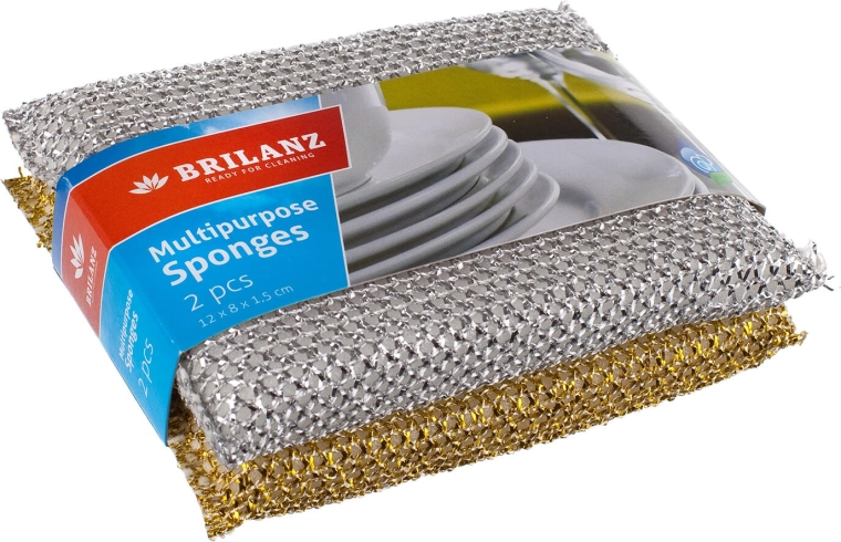 Set practic de doi bureți multifuncționali BRILANZ pentru curățenie zilnică. Datorită dimensiunilor de 12 × 8 cm, se potrivesc perfect în mână și îndepărtează eficient murdăria. Suprafața în mix de culori auriu și argintiu este ideală pentru curățare temeinică a veselei și a locuinței, iar structura rezistentă asigură o durată de viață îndelungată.