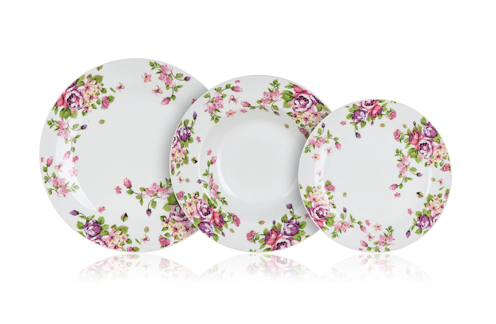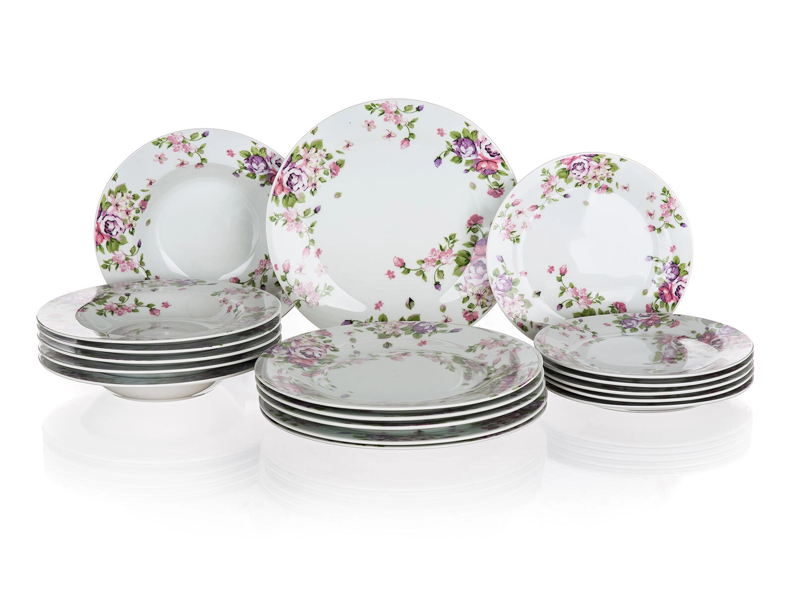 - 6× farfurie de desert, diametru 19 cm; 6× farfurie adâncă, diametru 21,5 cm; 6× farfurie întinsă, diametru 24 cm