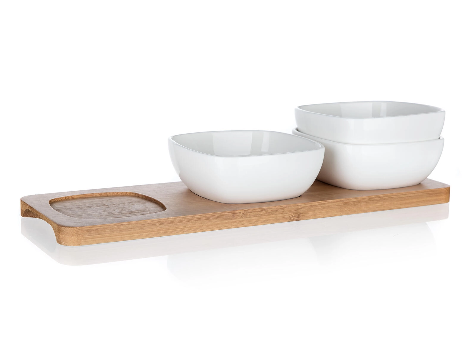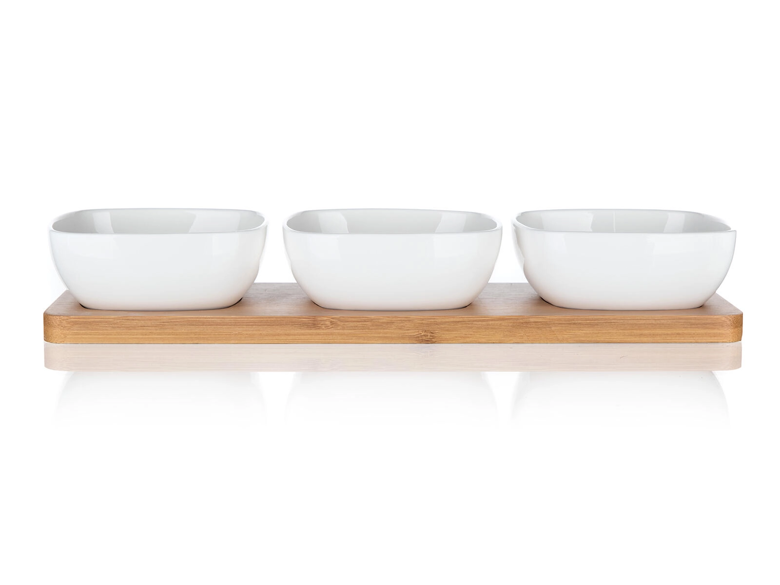 Acest set compact cu trei boluri pătrate din porțelan de calitate, pe un suport robust din bambus, oferă o soluție practică și estetică pentru servirea zilnică sau mesele festive. Porțelanul lucios evidențiază culorile delicatelor servite, iar bambusul natural adaugă servirii un accent cald și modern.