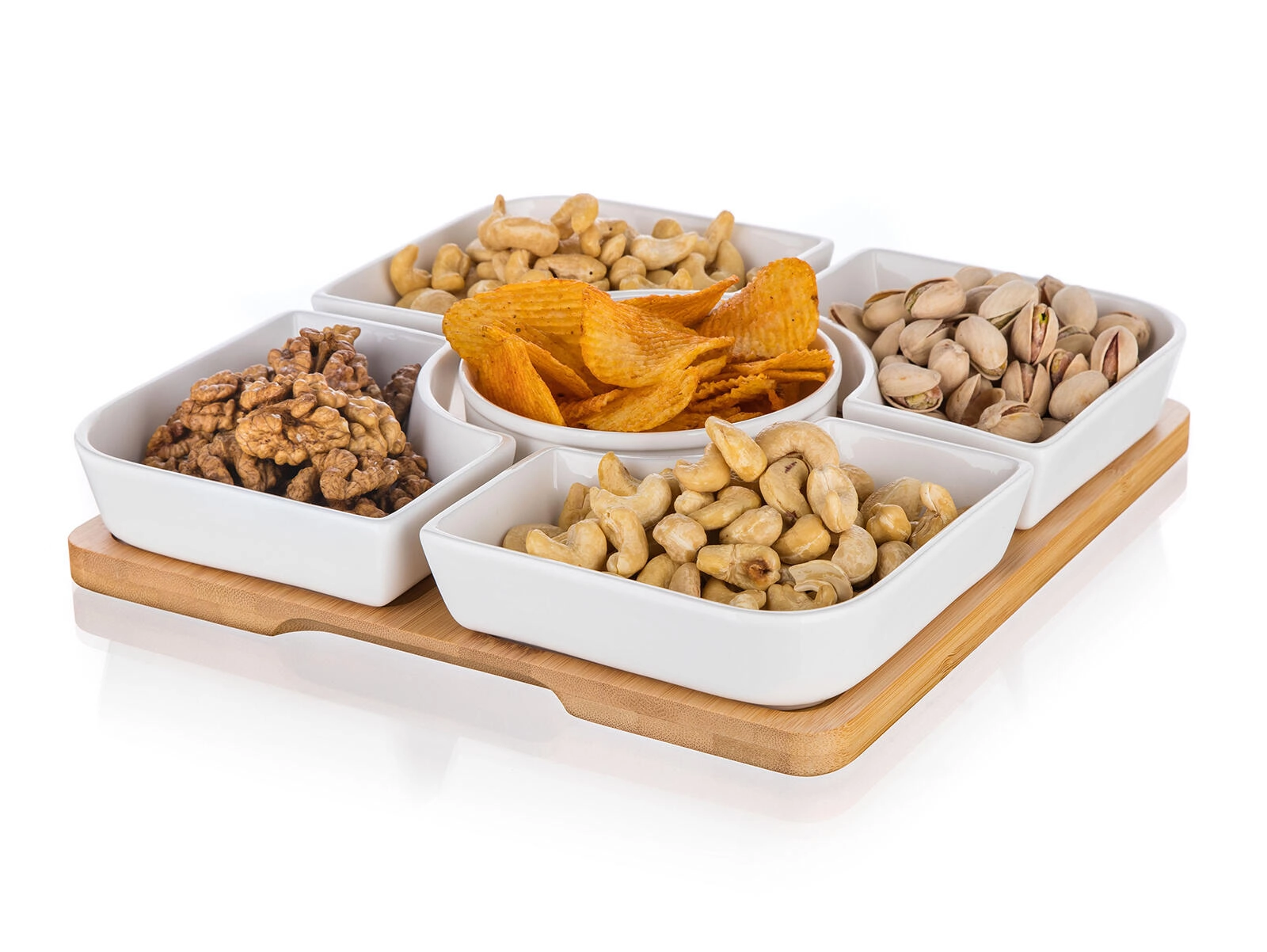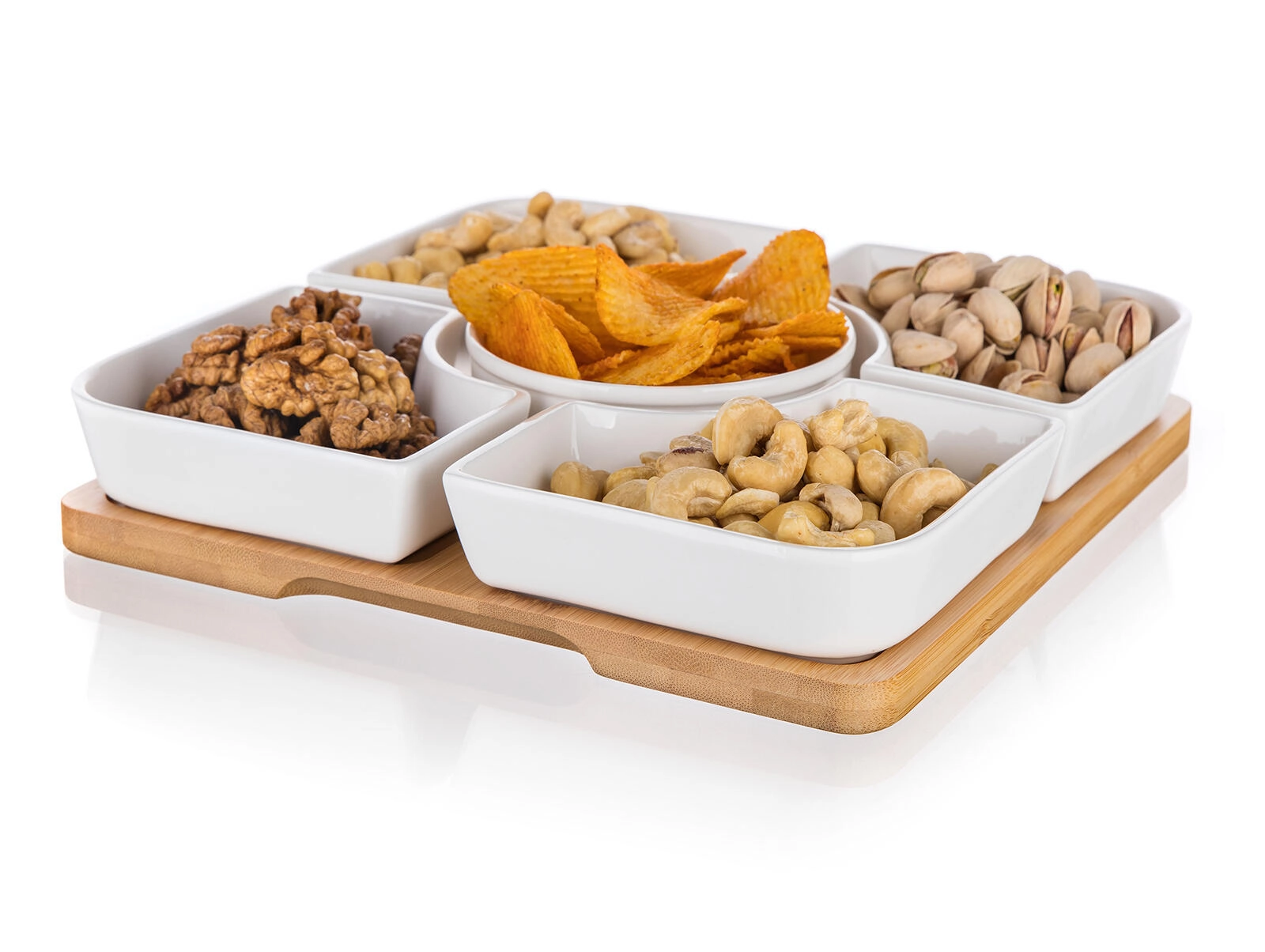 Patru boluri pătrate și un bol central rotund pe o tavă din bambus asigură o împărțire clară a gustărilor și o prezentare atrăgătoare pe masă.
