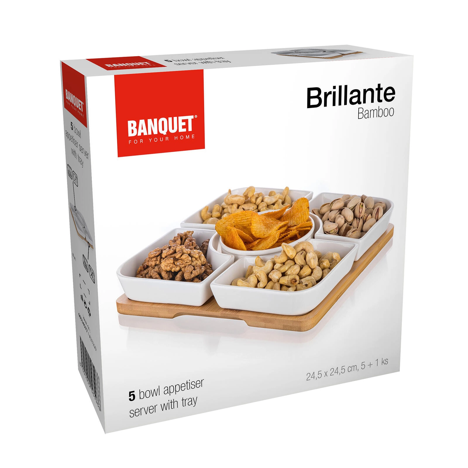 Îmbunătățiți servirea mesei cu setul practic și de design BRILLANTE. Cinci boluri din porțelan alb (patru pătrate și unul rotund în centru) sunt așezate pe o tavă solidă din bambus. Setul oferă o organizare clară a gustărilor și este ideal pentru petreceri în familie, seri cu prietenii sau servirea zilnică.