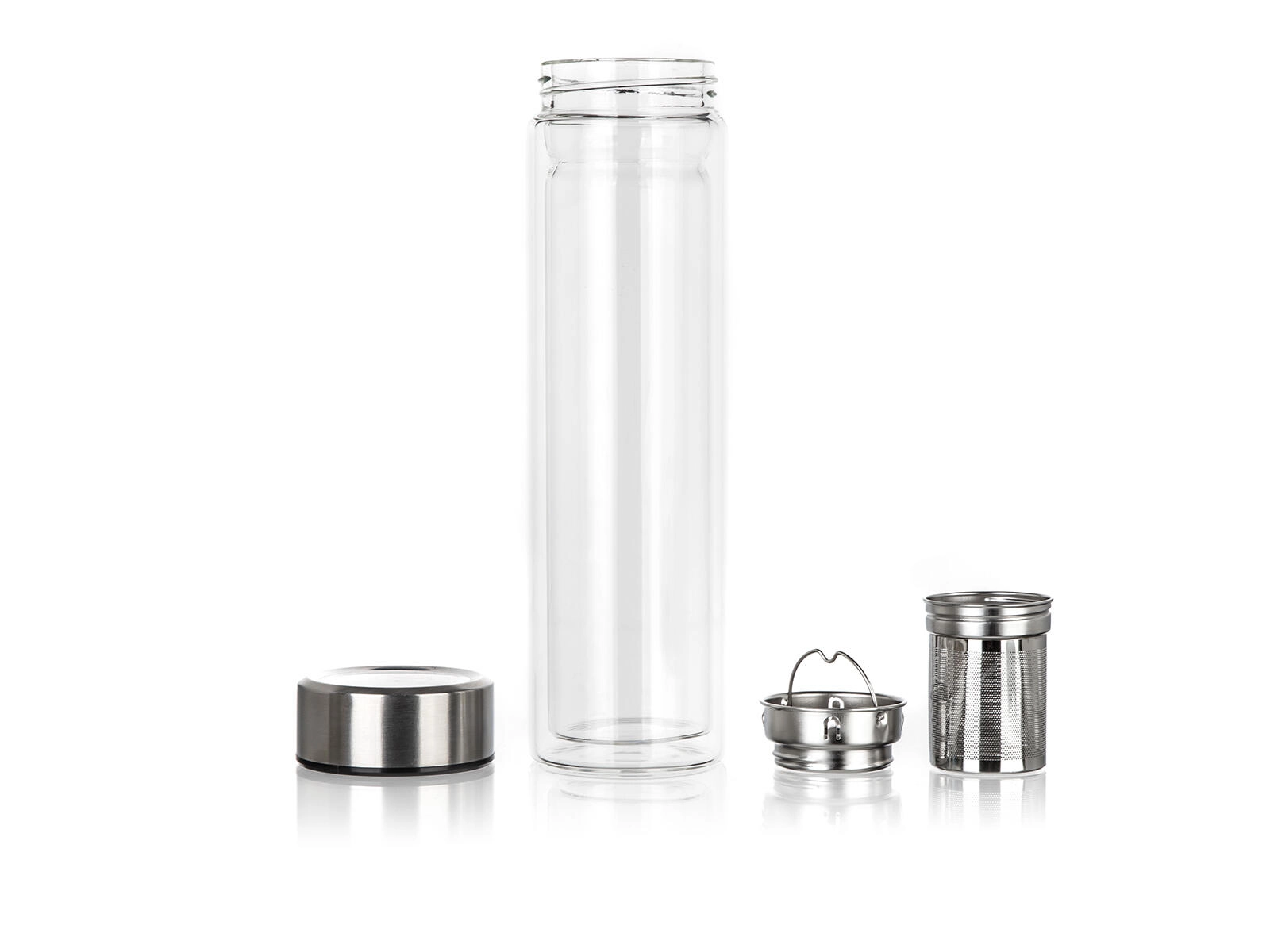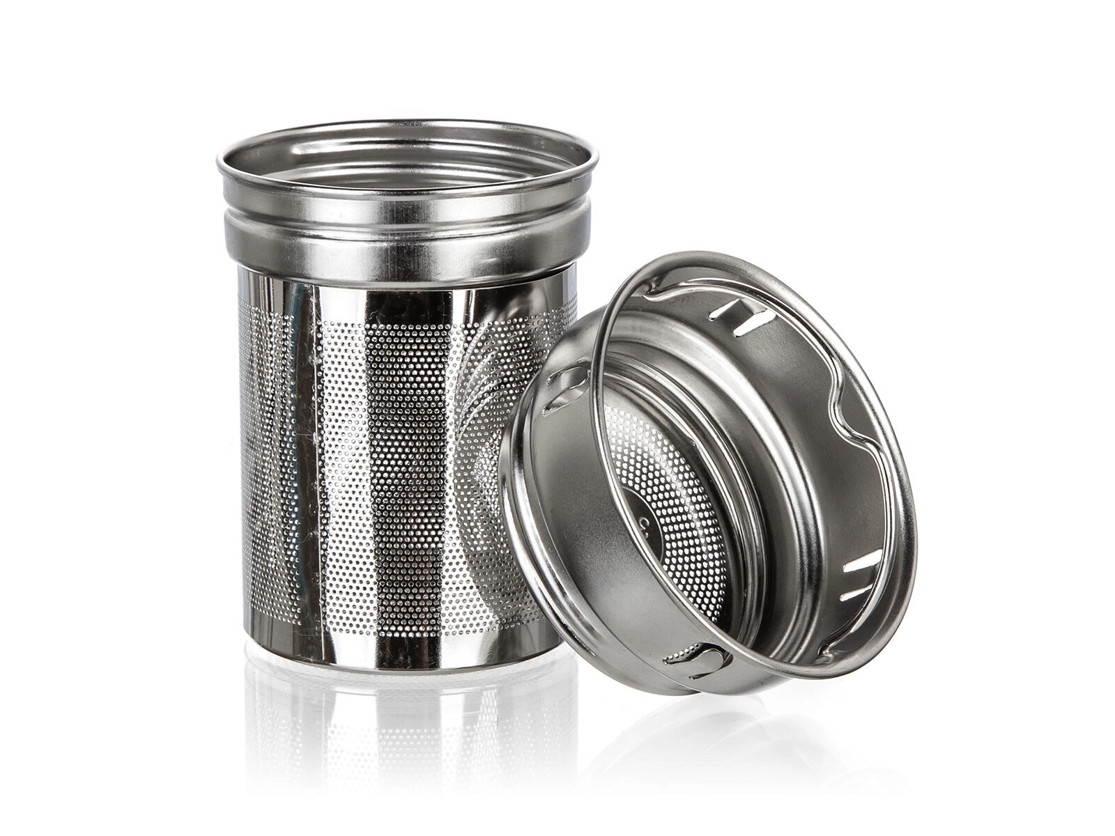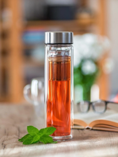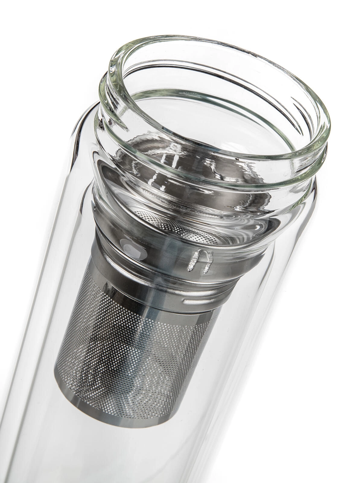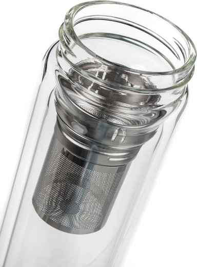 Sita integrată din inox permite infuzarea ușoară a ceaiului vrac, a plantelor sau prepararea infuziilor cu fructe direct în sticlă.