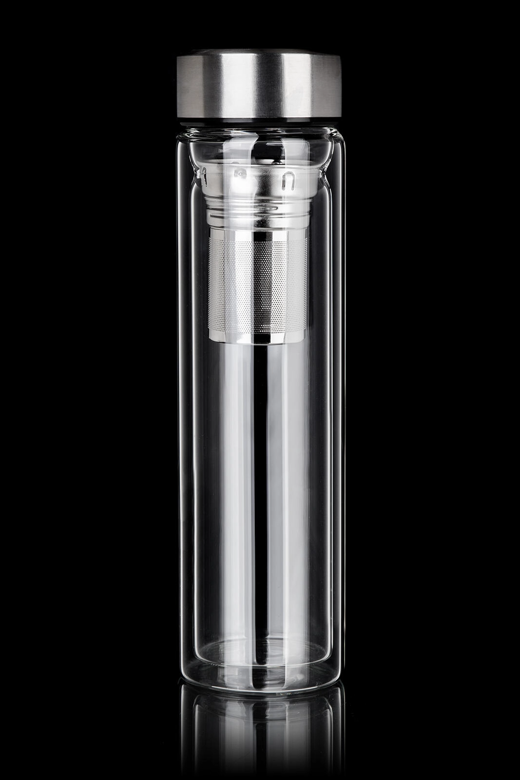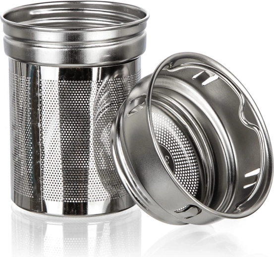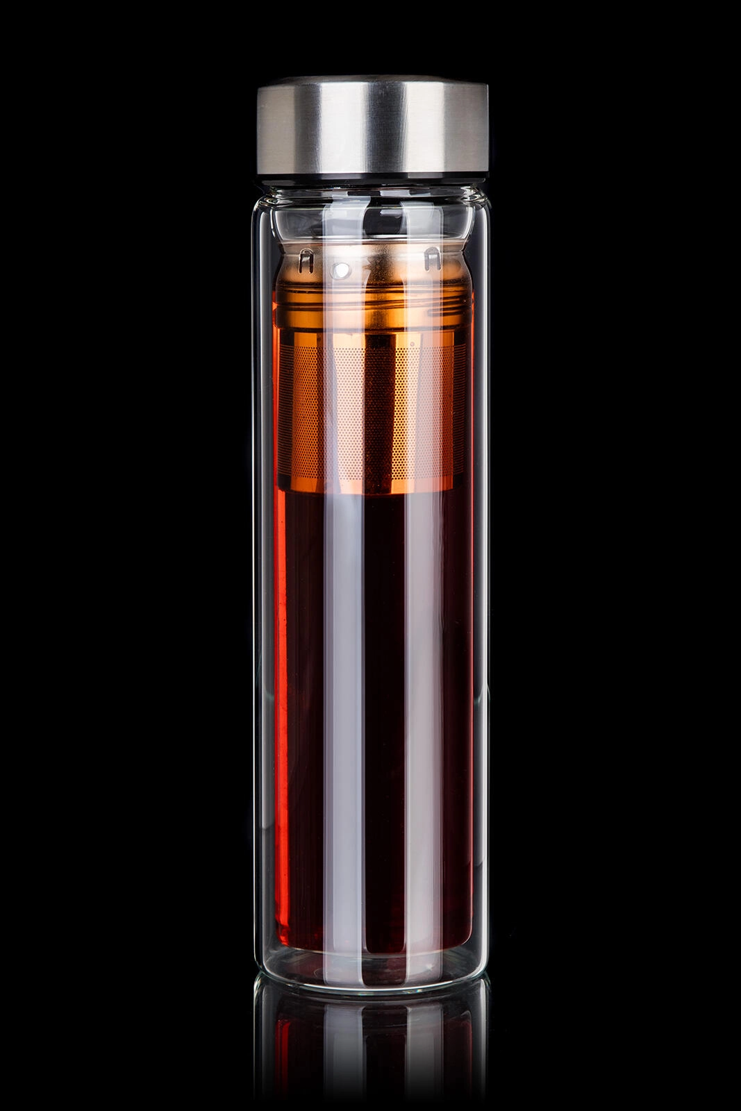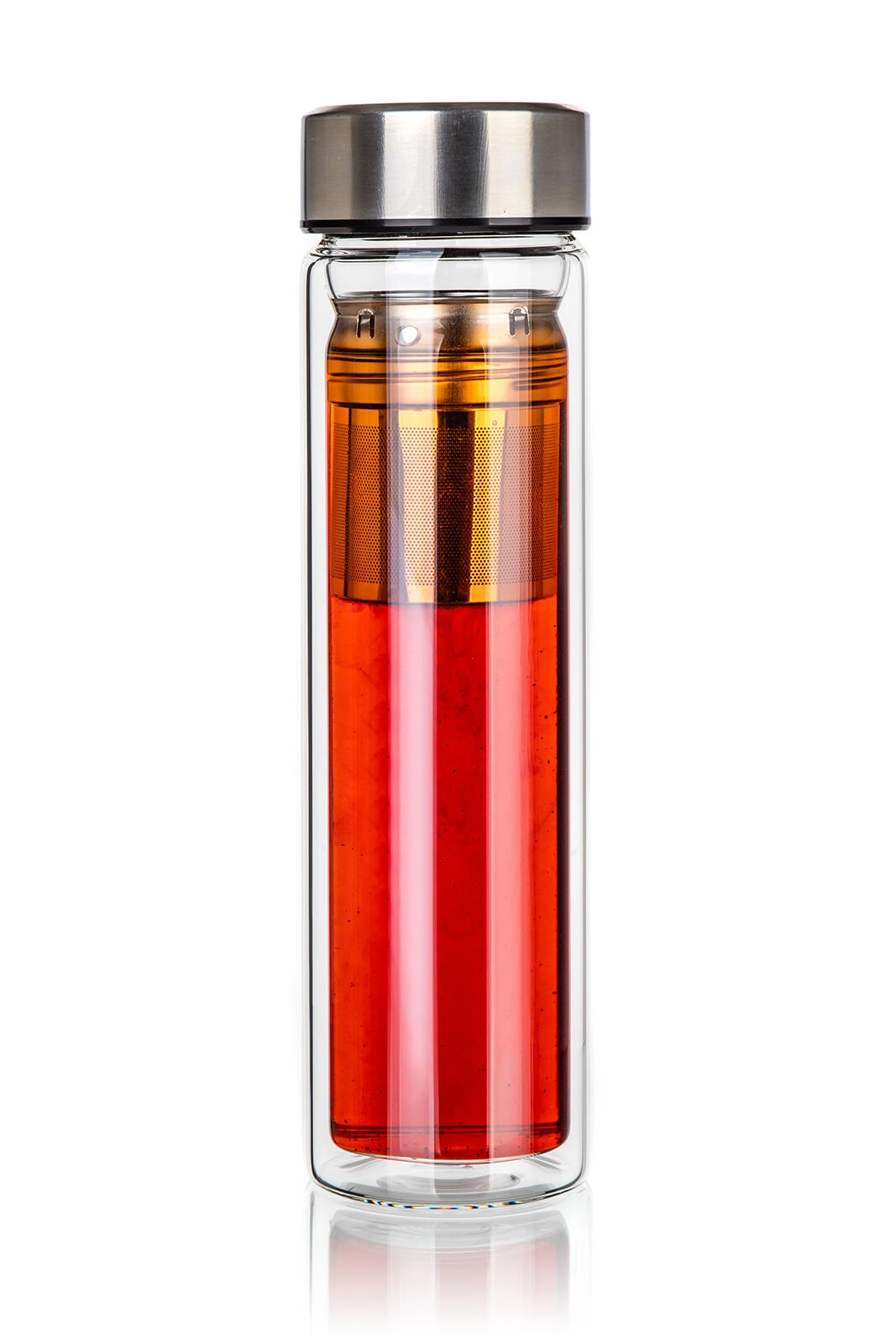 Sita integrată din inox permite infuzarea ușoară a ceaiului vrac, a plantelor sau prepararea infuziilor cu fructe direct în sticlă.