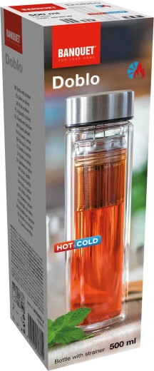 Bucură-te de băutura ta preferată oriunde și oricând. Sticla DOBLO este fabricată din sticlă borosilicată, rezistentă la temperaturi ridicate și șocuri termice. Construcția cu pereți dubli minimizează transferul de căldură la exterior, astfel încât sticla este confortabilă la ținut în mână, iar băutura își păstrează mai mult timp temperatura ideală – fie că este vorba de ceai fierbinte sau apă răcoritoare cu fructe.