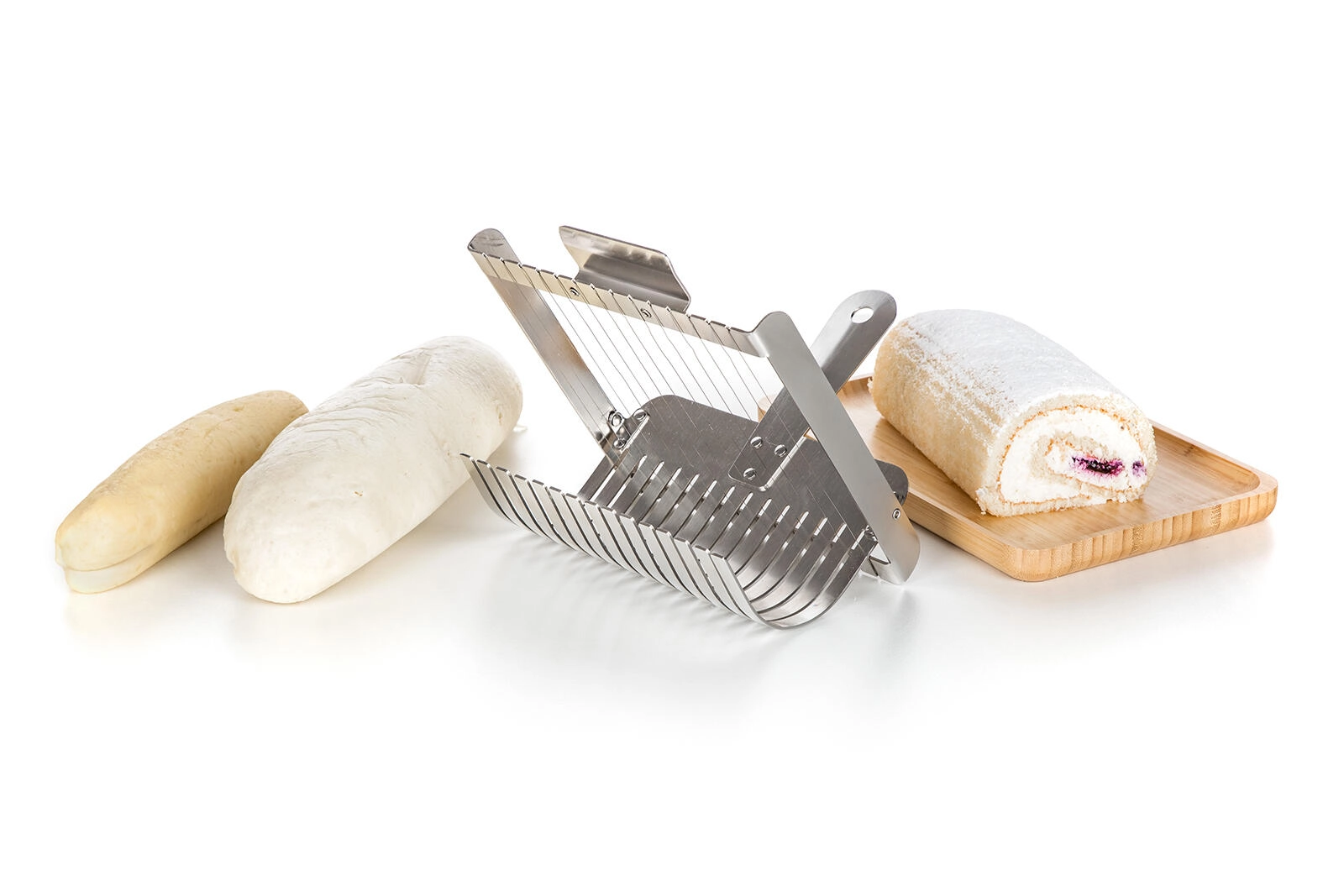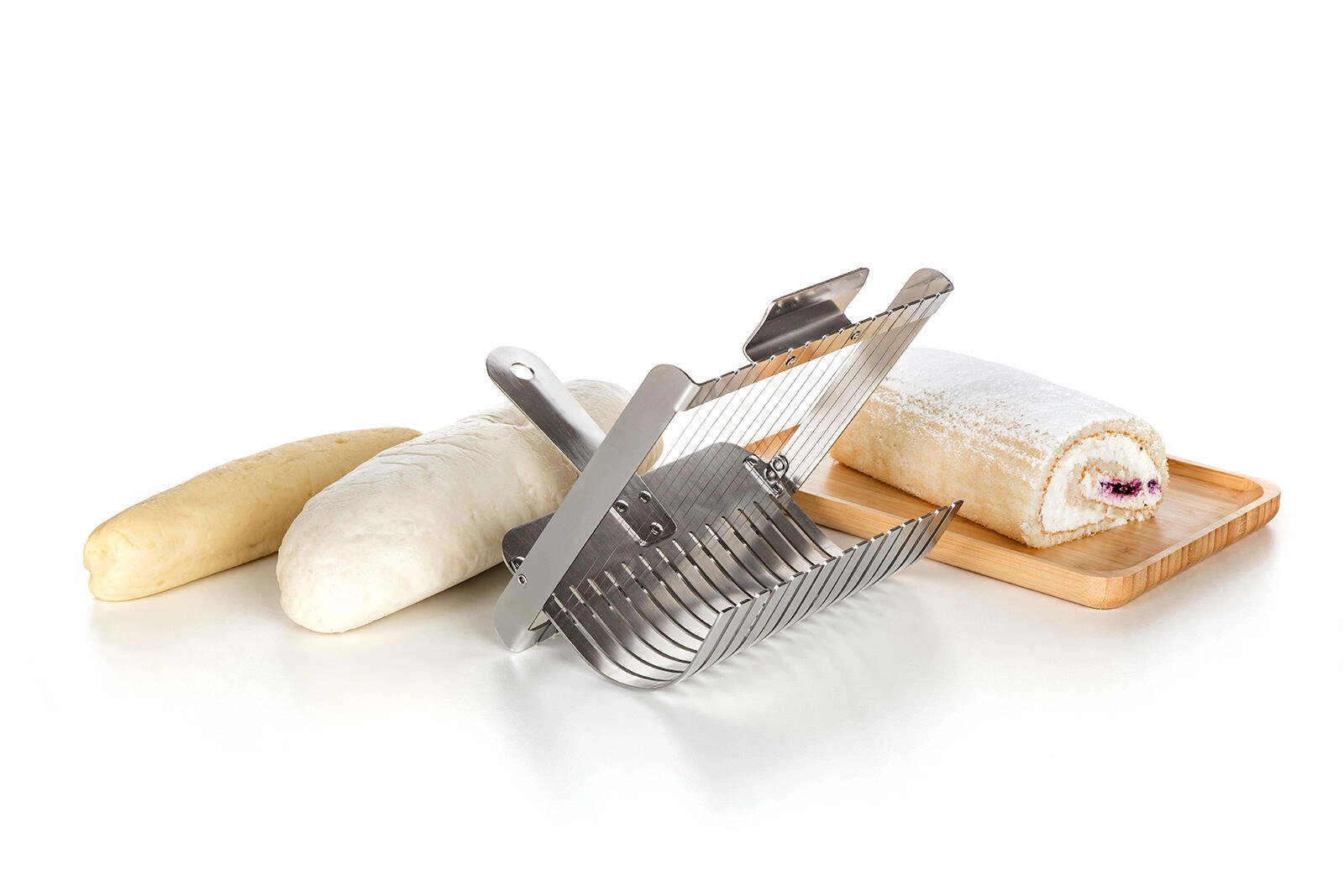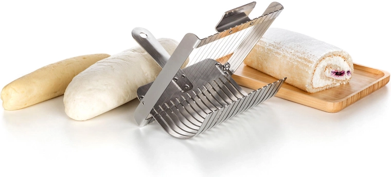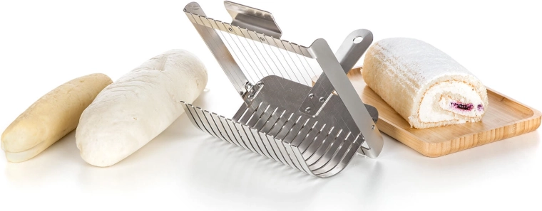 Mecanismul cu sârmă taie gogoșile și ruladele moi în felii curate, simetrice, fără a le strivi. Rezultat excelent la servire.
